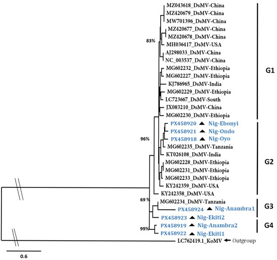 Diversity of the DsMV isolates from this study using the partial CI gene segment. The phylogenetic tree was constructed using the TN + F + I + G4 substitution model at 1000 bootstrap replicates. The Bootstrap branch support is indicated. The tree was constructed using the konjac mosaic virus isolate (LC762419.1) trimmed to the CI region as the outgroup. DsMV isolates from this study are indicated in blue font with the “Nig” prefix and the triangle symbol.