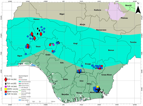 A map of Nigeria revealing agroecological zones, surveyed locations, and the status of taro leaf blight (TLB) in the surveyed areas in the wet (circles) and dry (triangles) seasons. It also shows the status of Dasheen mosaic virus (DsMV) in the market-sourced taro (square blocks). +ve = positive; -ve = negative. The markers on the map were spaced out for better visualization.