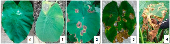 A structured questionnaire (Supplementary Document S9) was administered to collect the socio-demographic data of the farmers, including their gender, age, and knowledge of taro production, biotic constraints, and management practices. A separate survey form (Supplementary Document S10) was used to record the incidence and severity of foliar disease symptoms, especially those caused by P. colocasiae and virus. Educational materials, such as pictures of TLB and common taro viruses (mainly symptoms such as feathery and mosaic patterns, malformation and crinkling of the foliage, chlorosis, and severe stunting), were made available to farmers to facilitate the interview. Verbal consent was obtained from each participant before conducting the interviews. Additionally, data on the incidence and disease severity of TLB were also estimated from 20 plants in each field by using a “W” walking pattern and evaluating five plants along each transect of the “W” pattern [50]. The prevalence, severity, and incidence of TLB were calculated using the method of Abdulai et al. [46]. The severity rating was on a 0 to 4 rating scale, where 0 = no infection, 1 = 1–25% infection, 2 = 26–50% infection, 3 = 51–75% infection, and 4 = 76–100% infection (Figure 5). A total of 187 corms were collected from 19 out of 24 fields (harvesting time) for laboratory assessment of corm-borne diseases. In addition, 262 corms (all Eddoes) were collected from 26 marketers for laboratory-based studies on corm-borne diseases. The corms collected were local ecotypes.