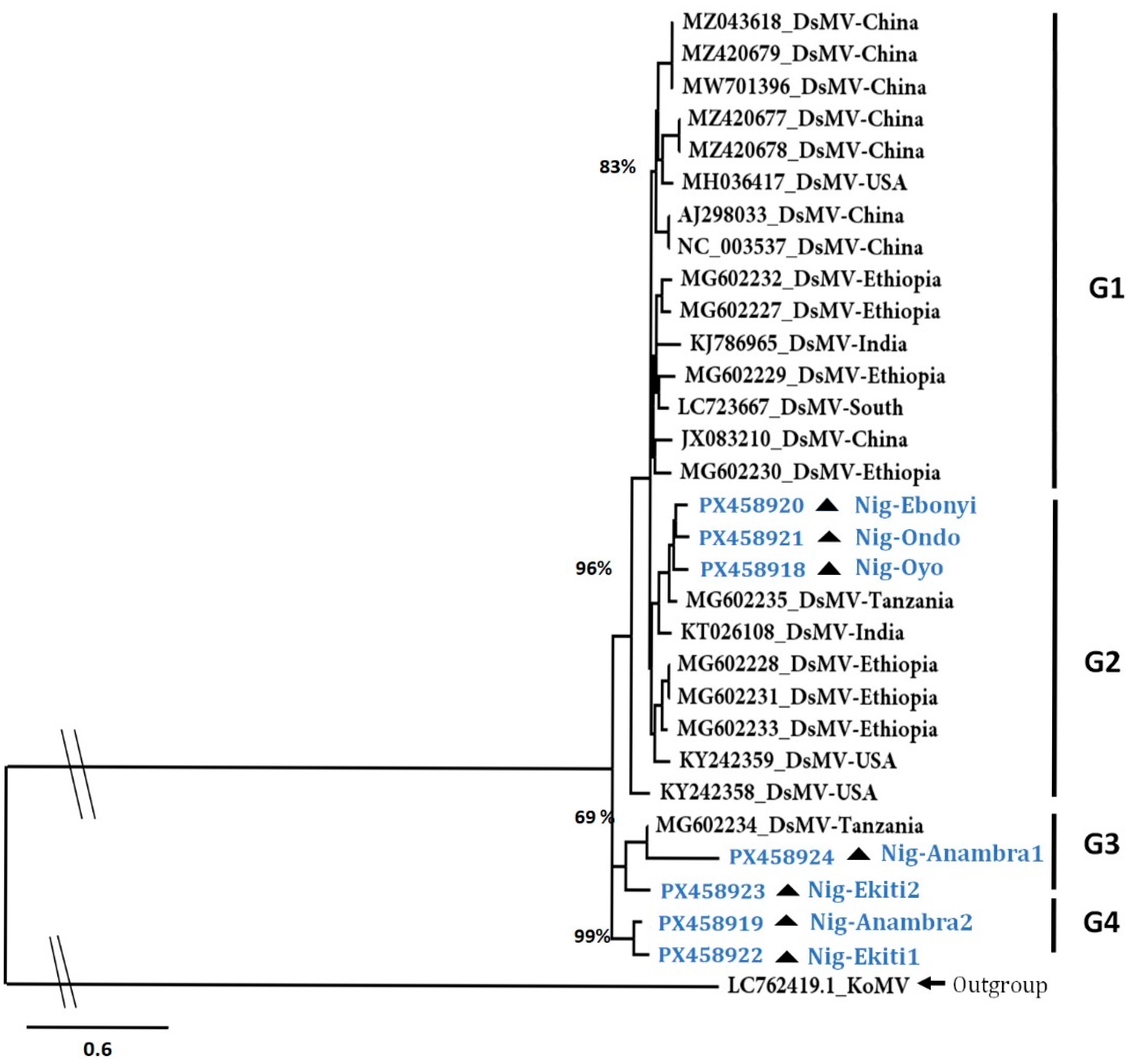 An assessment of viruses in corms collected from farms and markets revealed the presence of DsMV. Tests for other viruses, such as begomoviruses and badnaviruses, returned negative results. Additionally, the phylogenetic analysis of the DsMV isolates from Nigeria, compared with a representative set from the NCBI database, revealed that the Nigerian DsMV isolates are more closely related to those from Africa. The continuous recycling of planting materials from one season to the next, without the introduction of new seeds or improved varieties, makes controlling TLB and viral diseases difficult [