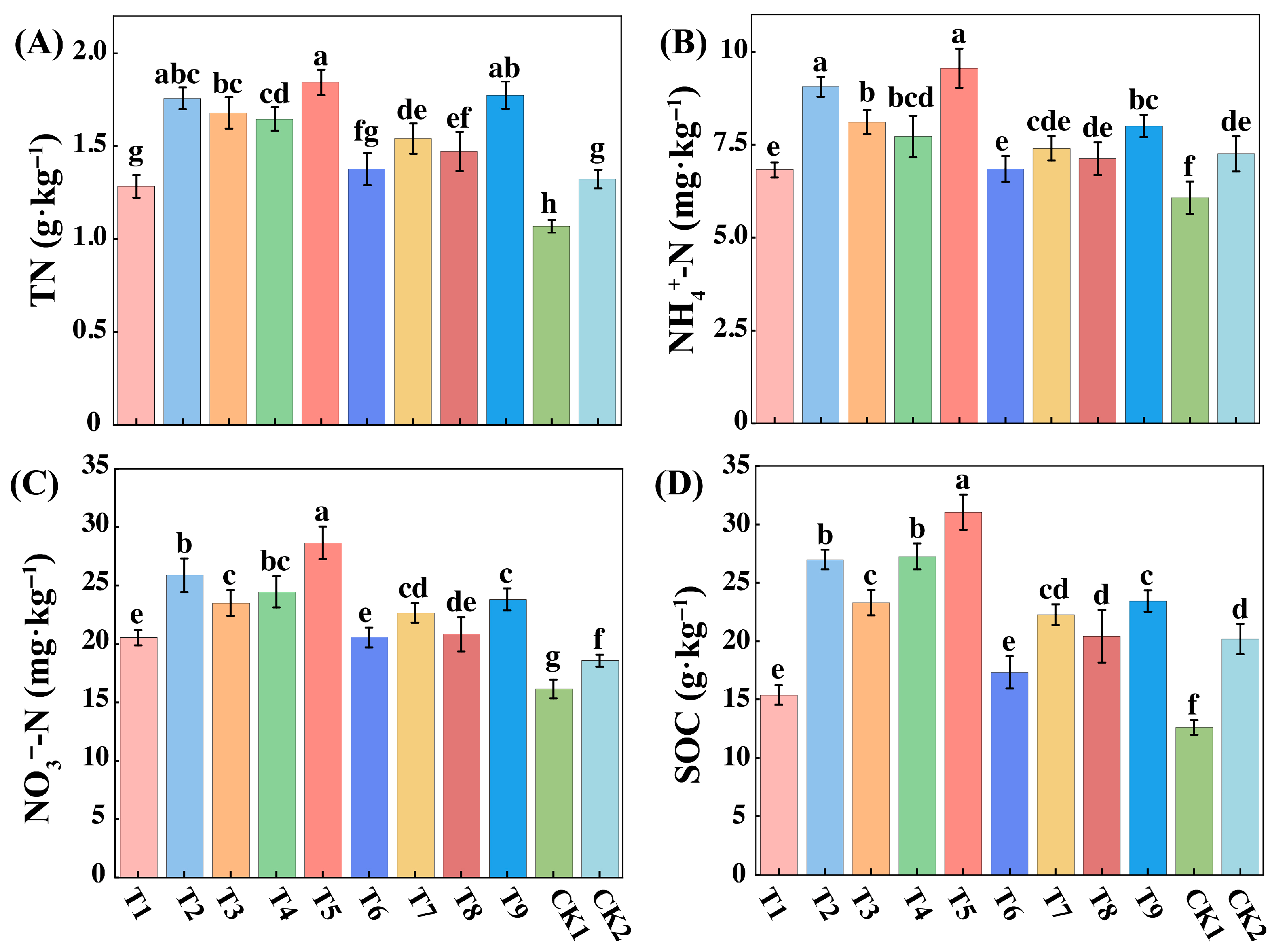 Soil nutrient levels varied significantly across the different treatments, with the T5 treatment consistently demonstrating the most substantial improvements in key indicators (Figure 1). Specifically, the total nitrogen (TN) content in the T5 treatment was the highest observed, representing a 72.43% and 39.31% increase compared to the CK1 and CK2 control groups, respectively (Figure 1A). A similar and pronounced trend was observed for mineral nitrogen. The ammonium nitrogen (NH4+-N) content in T5 was 31.73% higher than in the CK2 control (Figure 1B). Furthermore, the nitrate nitrogen (NO3-N) level in T5 was 77% higher than in the CK1 control (Figure 1C). The T5 treatment also proved most effective at enhancing soil organic carbon (SOC), reaching a level of 31.03 g/kg, which was 53.73% higher than the CK2 controls, respectively (Figure 1D). Other soil properties were also affected by the treatments (Supplementary S3A–D). The highest soil moisture content (SMC) was recorded in the T6 treatment. Concurrently, soil temperature (T) showed a decreasing trend with higher sediment concentrations, reaching its lowest point in the T9 treatment (22.23 °C). Corroborating the individual nutrient results, the comprehensive soil quality index (SQI) also peaked in the T5 treatment (0.68), confirming it as the most effective strategy for improving overall soil quality.