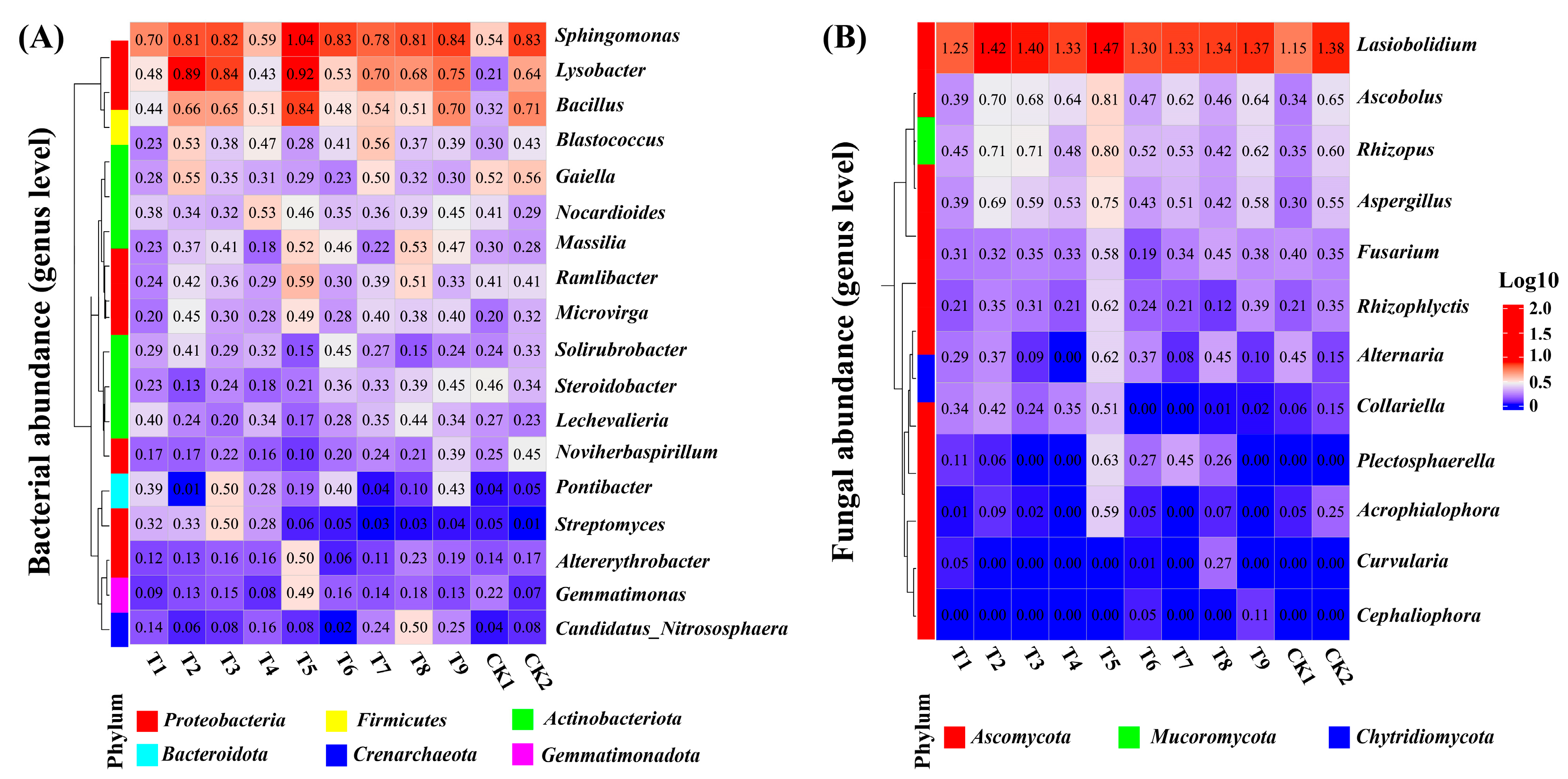 Figure 2. Winter wheat microbial community abundance (genus level). Note: The clustered heatmap (A,B) demonstrates the abundance of soil bacteria and fungi at the genus level.