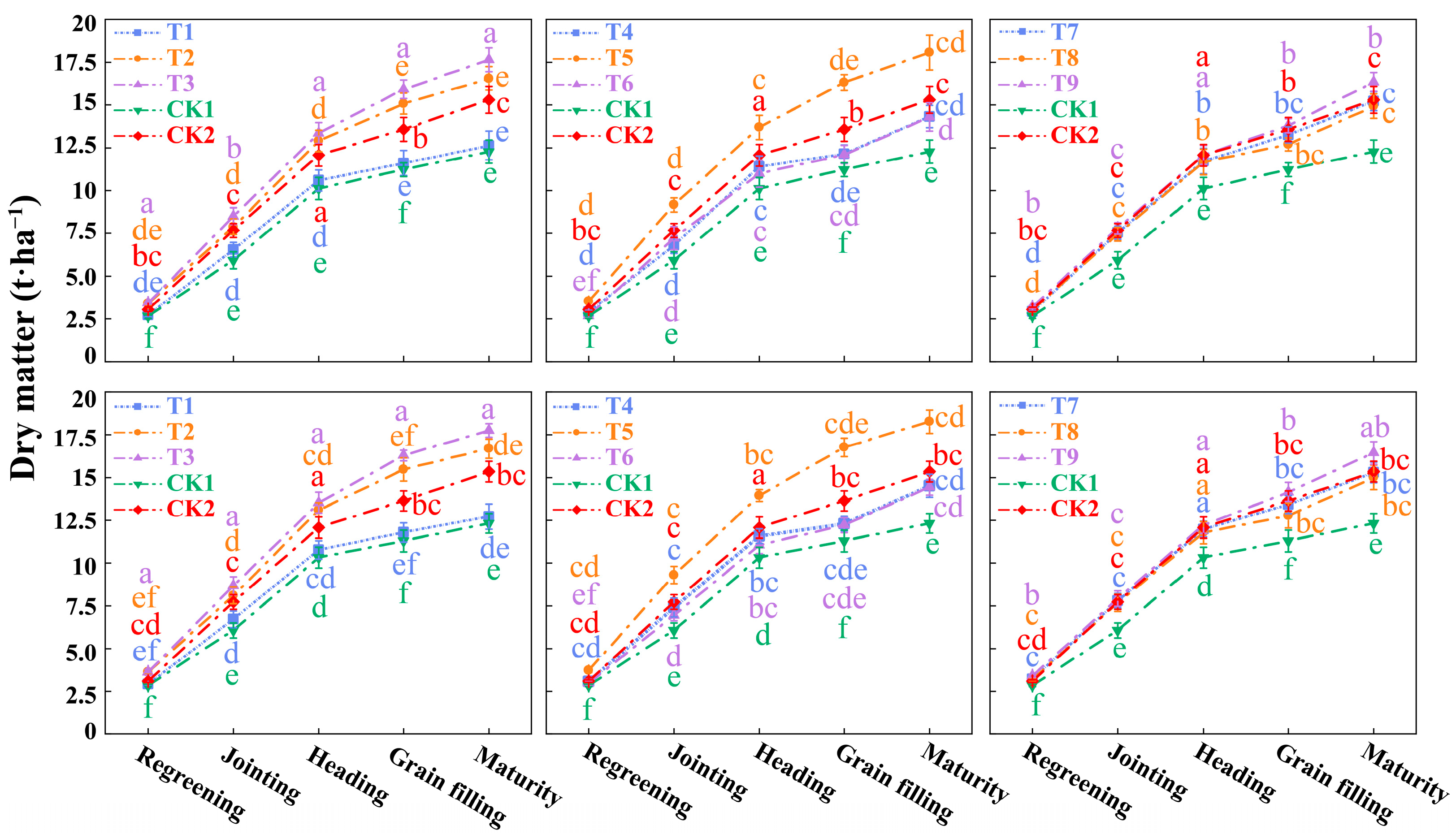 Figure 5. Dry matter of winter wheat in 2023–2024 and 2024–2025. Note: The data are the average values from three parallel treatments for dry matter of winter wheat. Different lowercase letters denote significant differences at p < 0.05.