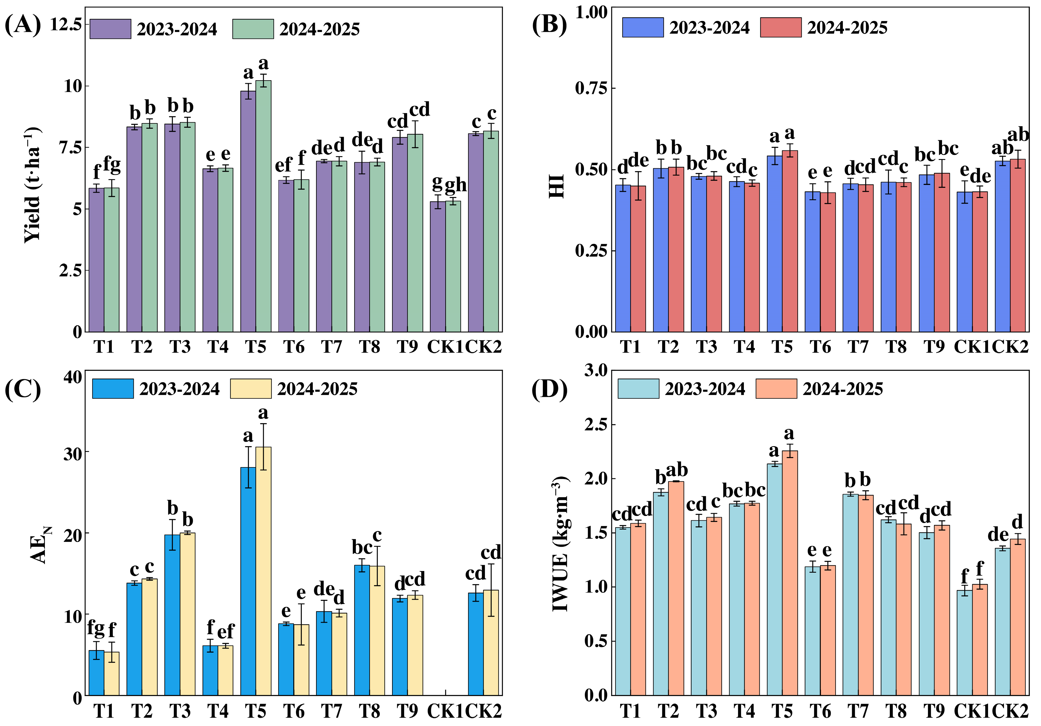Figure 6. Winter wheat yield and water and nitrogen use efficiency in 2023–2024 and 2024–2025. Note: The data are average values from three parallel treatments for the yield (A), harvest index (B), agronomic efficiency of nitrogen (C), and irrigation water use efficiency (D) of s winter wheat in 2023–2024 and 2024–2025. HI, harvest index; AEN, agronomic efficiency of N (kg·kg−1); IWUE, irrigation water use efficiency (kg·m−3). Different lowercase letters denote significant differences at p < 0.05.