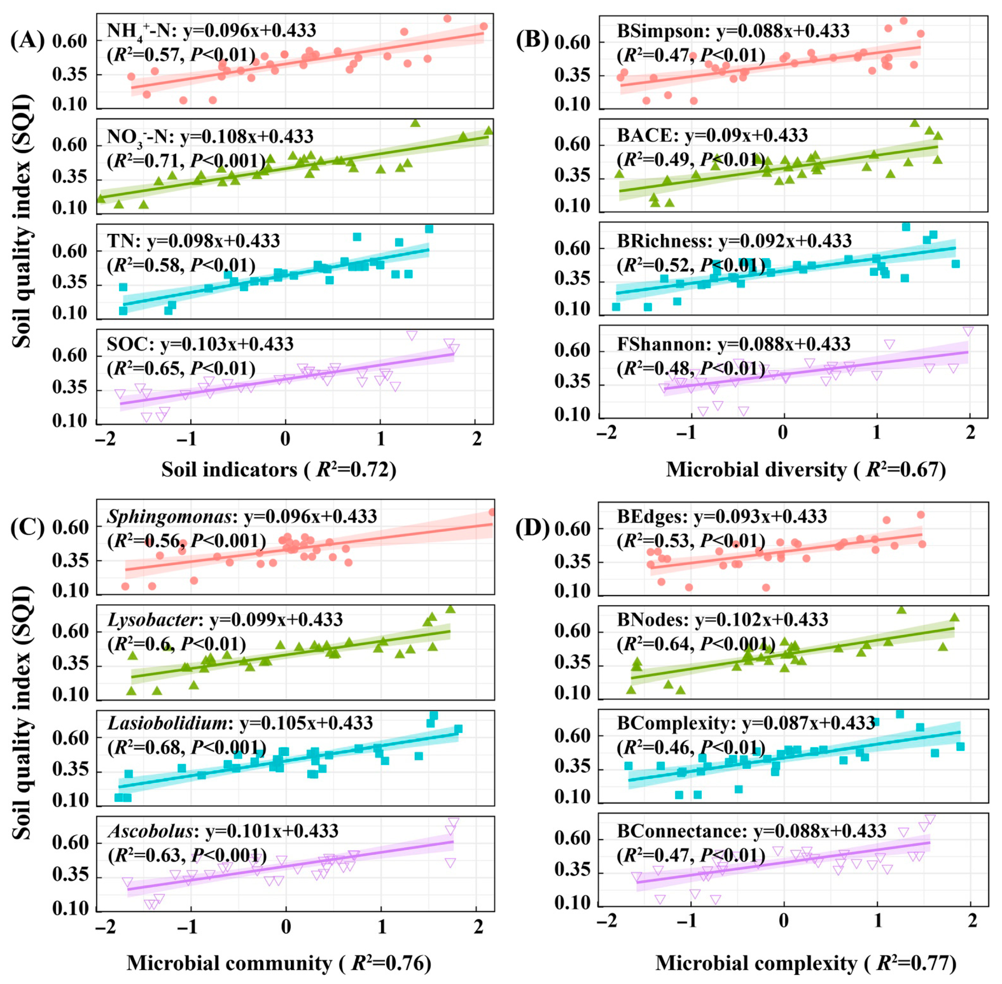 Figure 7. Regression analysis of environmental factors and wheat soil quality. Note: (A) shows the regression analysis between soil indicators (organic carbon, total nitrogen, nitrate nitrogen, ammonium nitrogen, etc.) and soil quality for winter wheat. (B) Regression analysis of soil microbial diversity indicators (bacteria/fungi Chao1, Shannon, Simpson, ACE, etc.) and soil quality for winter wheat. (C) Regression analysis of soil microbial community indicators (Sphingomonas, Lysobacter, Lasiobolidium, Ascobolus, etc.) and soil quality for winter wheat soil. (D) Regression analysis of co-occurrence topological network complexity indicators (nodes, edges, average degree, linkage density, etc.) and soil quality for winter wheat soil microbial networks. Due to the diversity and co−occurrence network topology complexity indicators of bacteria and fungi, which have two parts: B represents bacteria and F represents fungi, such as BSimpson representing bacterial Simpson and Fshannon representing fungal Shannon (the same applies below).