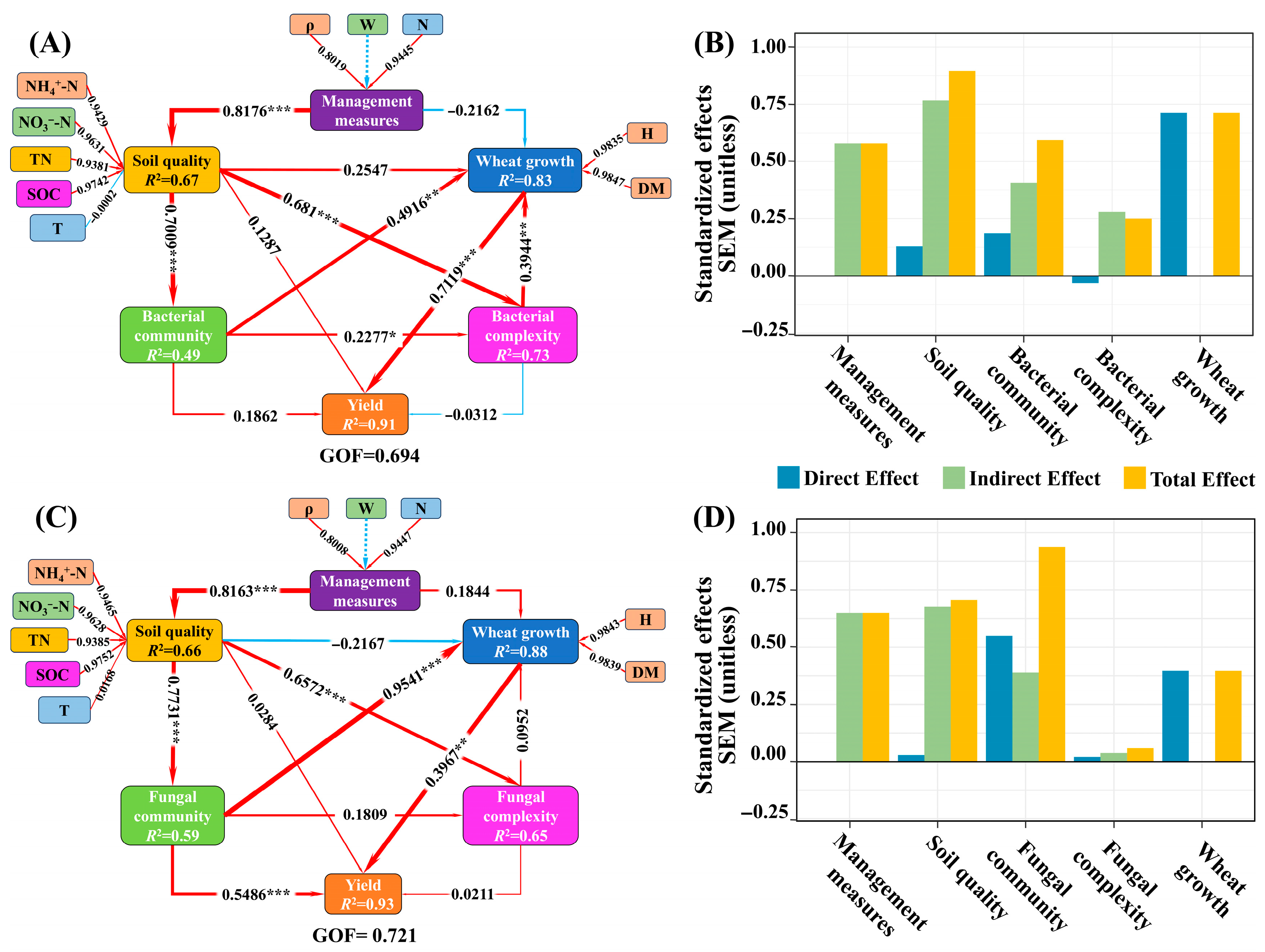 Figure 9. Partial least squares structural equation (PLS-SEM). Note: Figure (A,C) show the structural equation models of management measures, soil nutrients, bacterial and fungal communities, network complexity, and the impact of winter wheat growth on yield based on soil bacterial and fungal systems. The thickness of the line reflects the magnitude of the path coefficient, and the width of the arrow is proportional to the strength of the association. The red solid line and blue dashed line distinguish between positive and negative relationships. Significance symbols: * p < 0.05, ** p < 0.01, *** p < 0.001. Management measures include sediment concentration in muddy water (ρ), irrigation (W), and nitrogen fertilizer application (N). Soil nutrients include TN, NH4+-N, NO3-N, SOC, SMC, pH, and T. Figure (B,D): Standardized effects modelled based on partial least squares structural equations of soil bacteria and fungi can be classified into indirect effects, direct effects, and total effects.