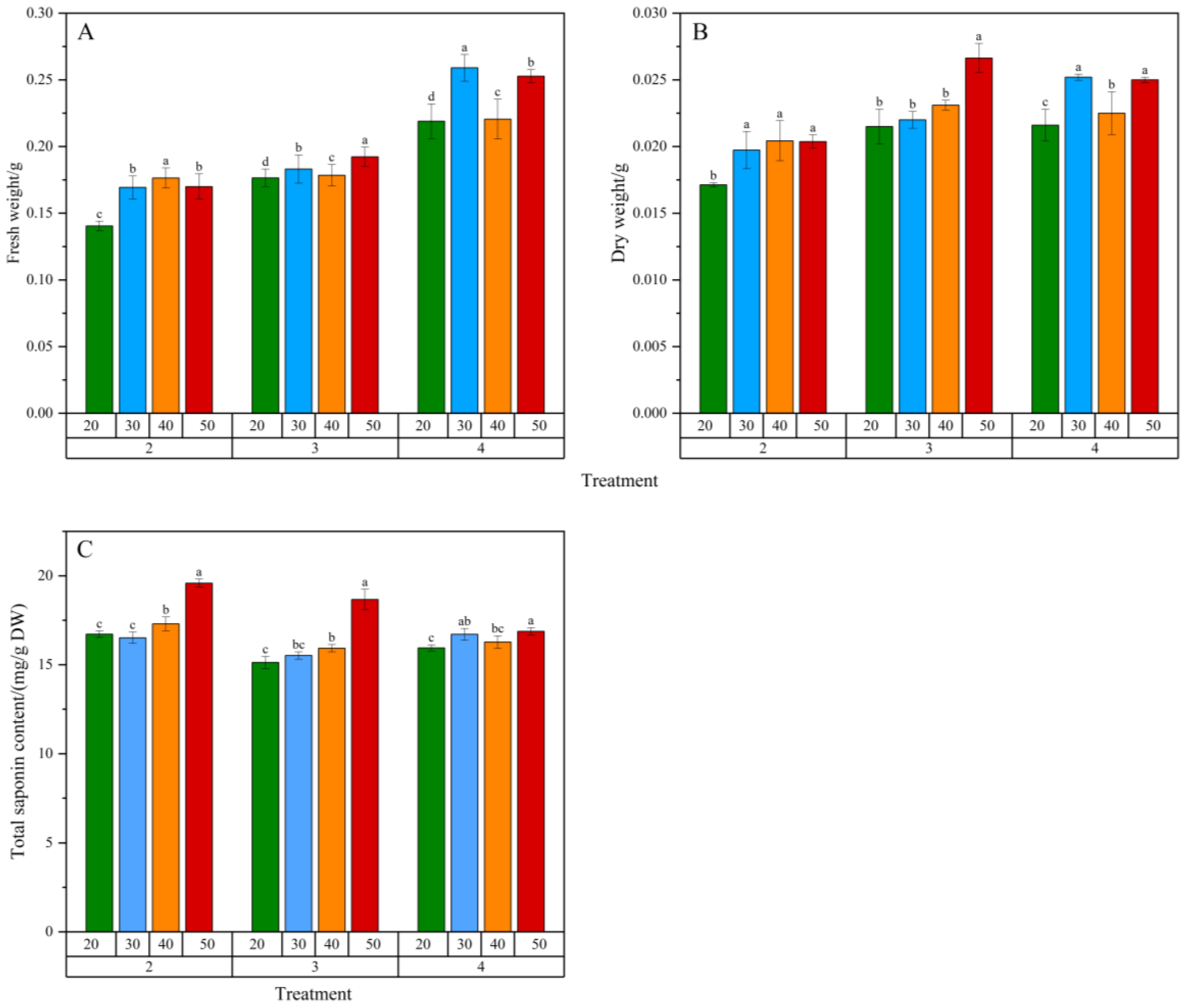 - Total saponin content: Dried adventitious roots were ground into powder and extracted twice with 12 volumes of water-saturated n-butanol using ultrasonic assistance at 40 °C for 50 min [25]. After evaporating the n-butanol, the residue was dissolved in methanol, and the total saponin content was determined using the sulfuric acid-vanillin colorimetric method [26].
