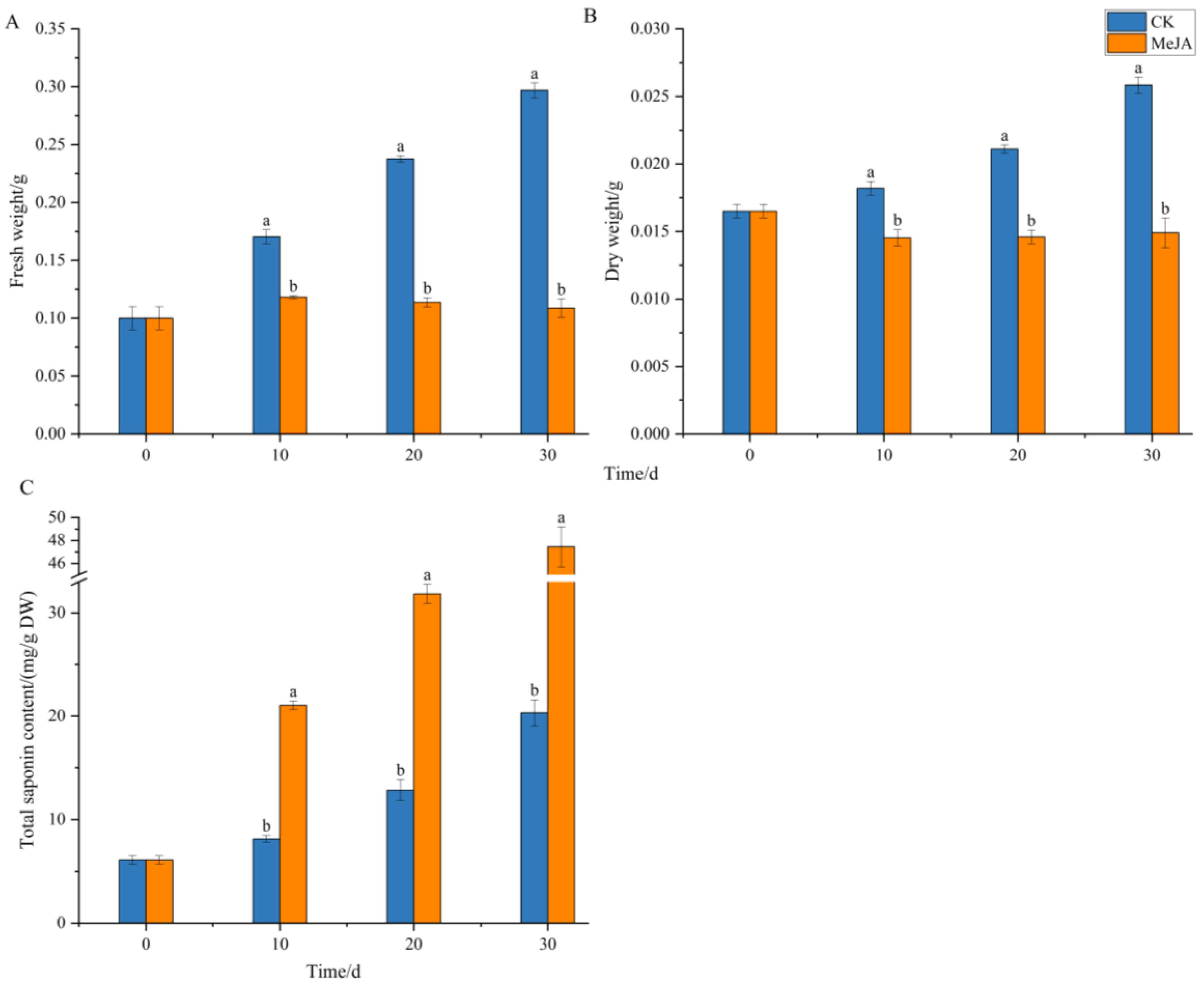 2.4. Effect of Methyl Jasmonate on Biomass and Total Saponin Content