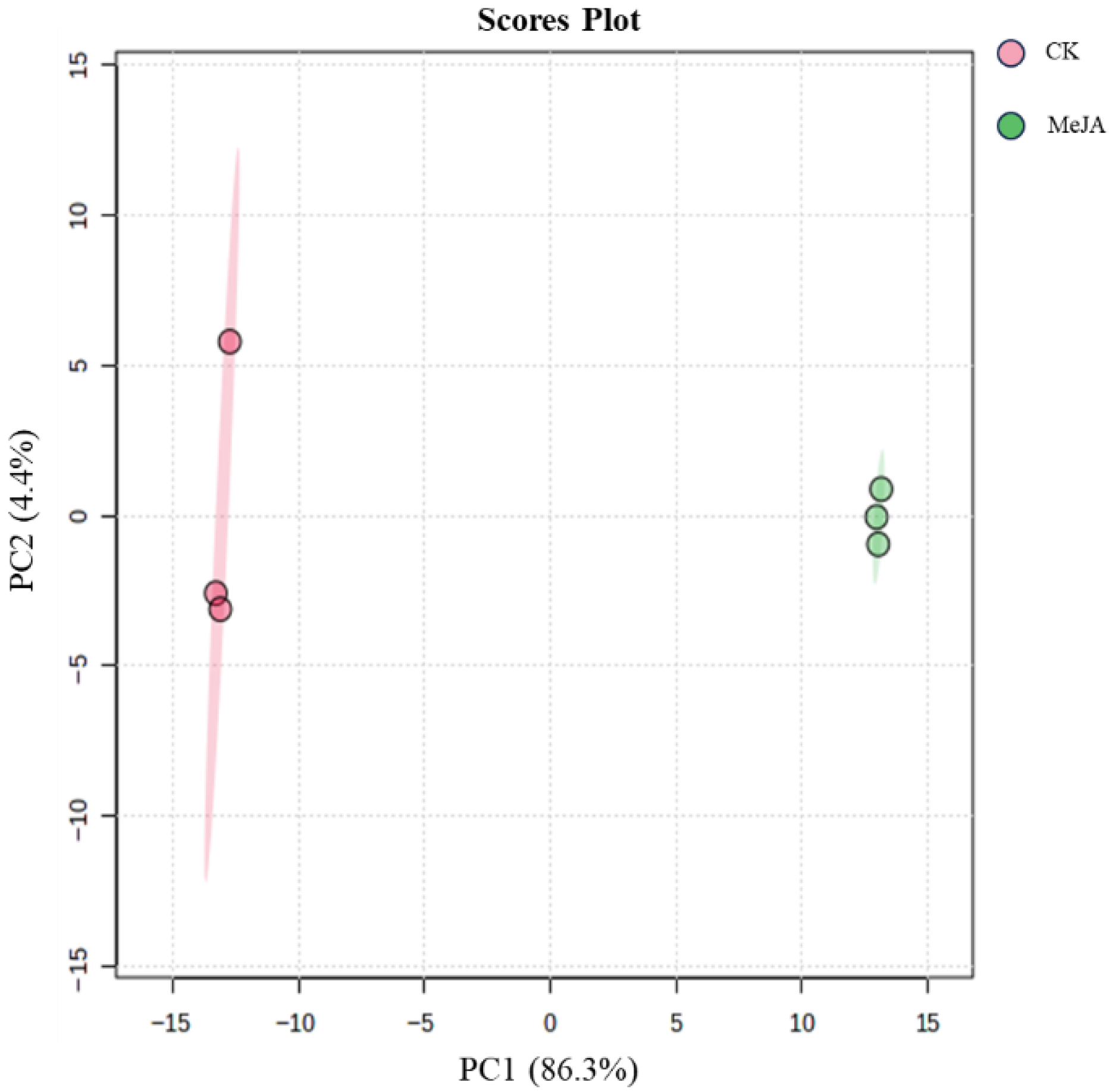 2.5.2. Multivariate Statistical Analysis of Metabolites Induced by Methyl Jasmonate