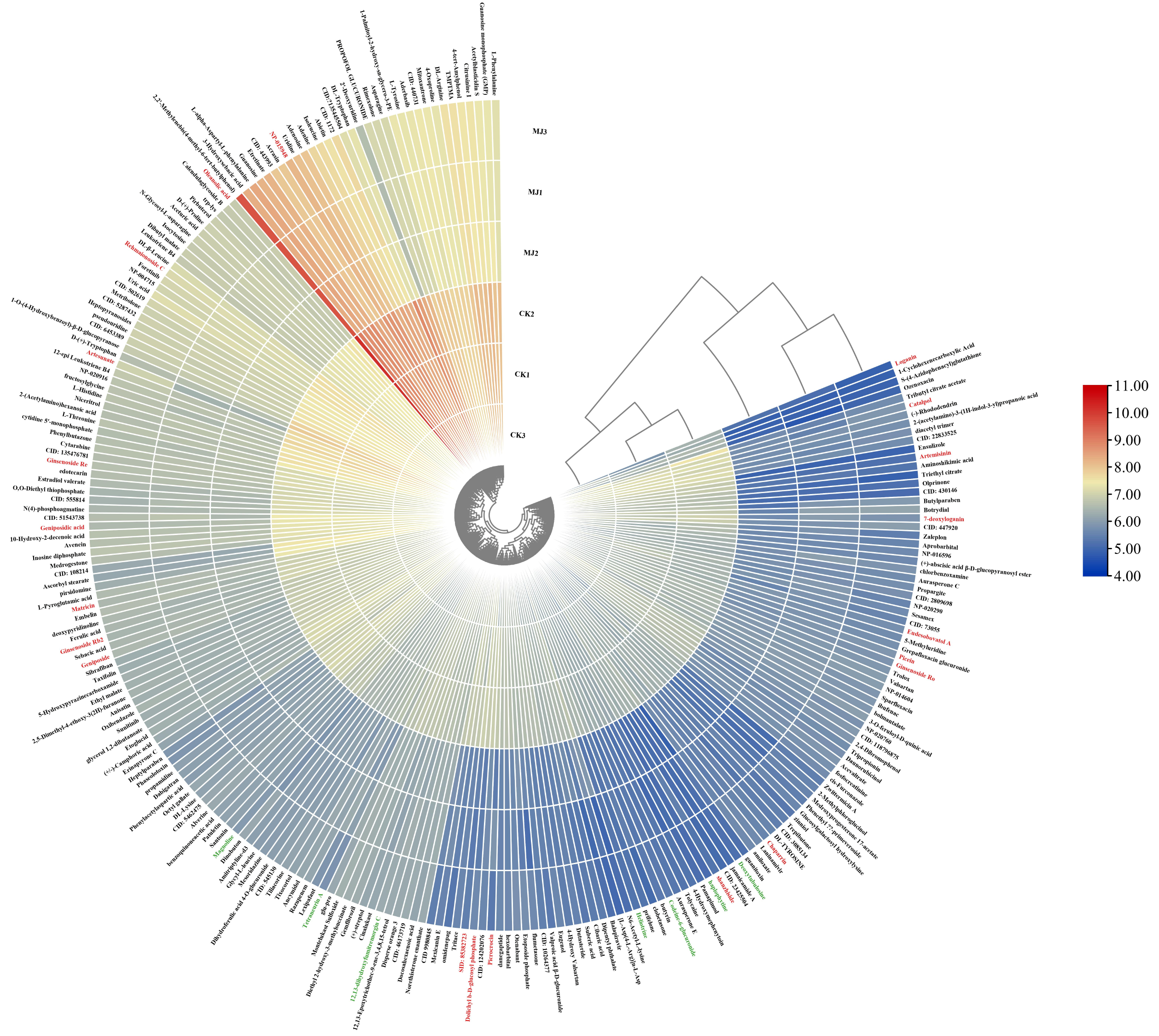 | Notoginsenoside R2 | 11.11 | 767.4743 | 767.4709 | −4.430 | 637.4300, 475.3779, | |