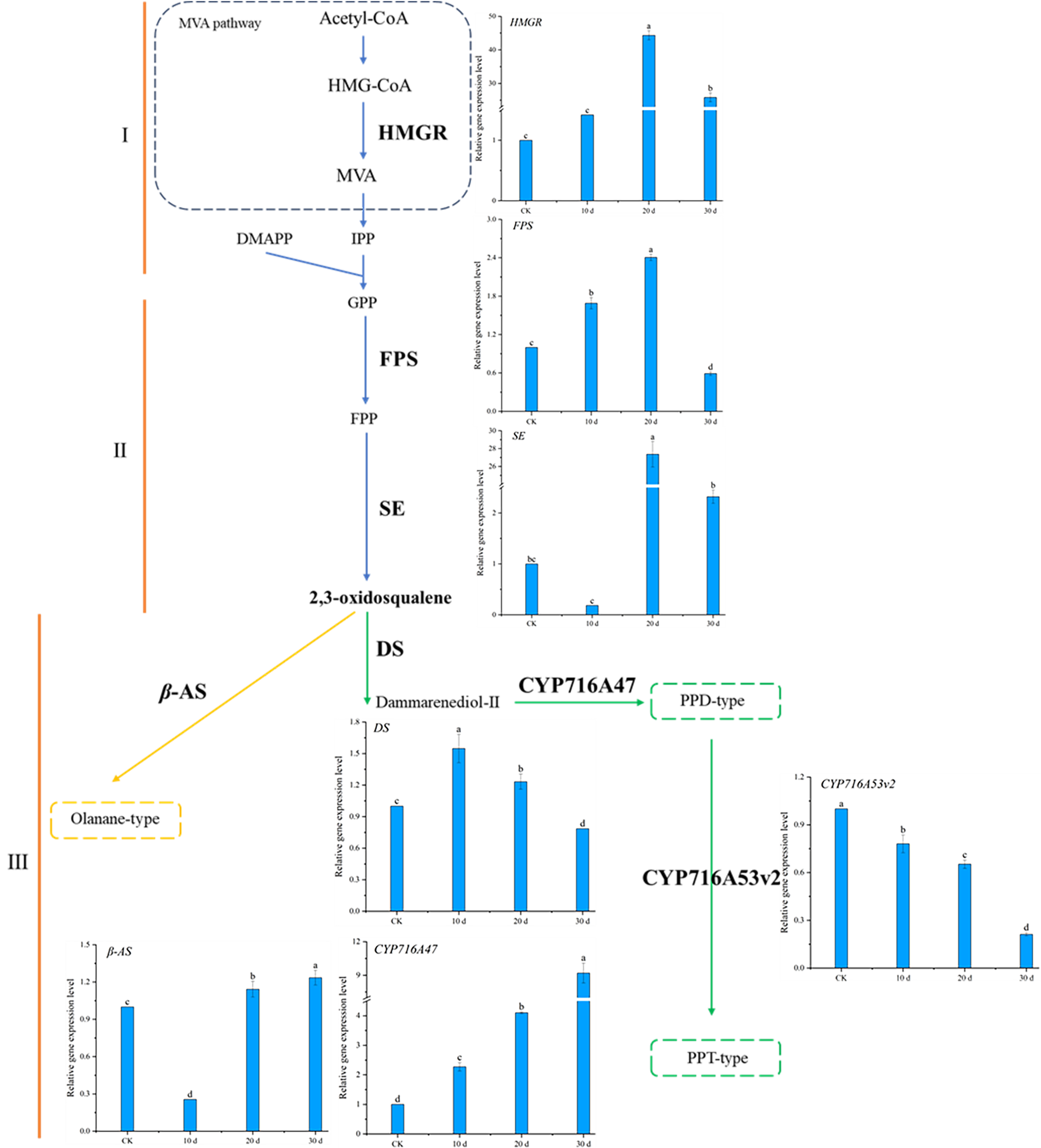 2.7. Effect of Methyl Jasmonate on the Expression of Ginsenoside Biosynthesis Genes in P. notoginseng