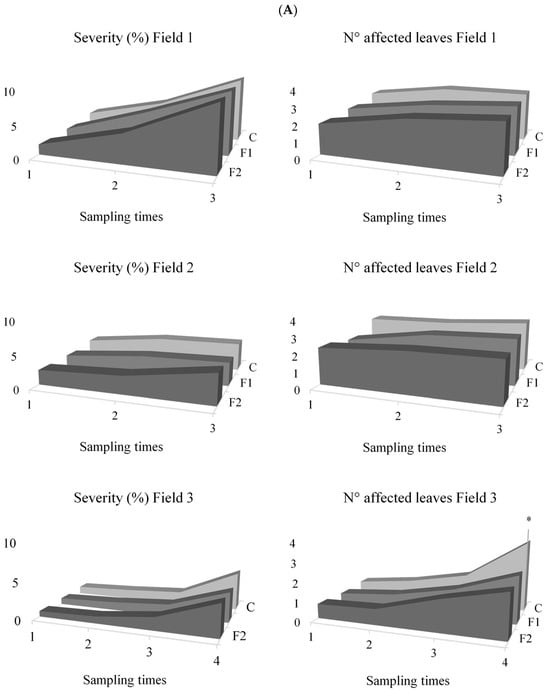 NCLB severity and number of affected leaves were evaluated across three fields at different sampling times. In Field 1, which was evaluated in the same campaign year as Field 2, no significant differences among treatments were detected for severity (F = 1.17; d.f. = 2; p = 0.3167) or number of affected leaves (F = 1.58; d.f. = 2; p = 0.2117). Mean values were 5.59 ± 3.46% for severity and 2.62 ± 0.70 for the number of affected leaves (Figure 2).