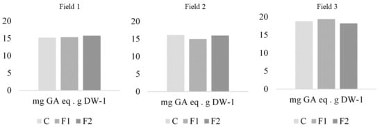 Phenolic compound concentration (mg GA eq g DW−1) for each treatment in the three fields, for formulate 1 (F1), formulate 2 (F2) and control (C).