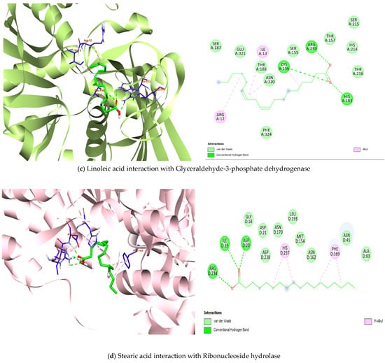α-linolenic acid fared better in terms of the binding affinity to 5J9G (−5.6 kcal/mol). More importantly, all seven fatty acids interact strongly with the protein by having both hydrophilic and hydrophobic interactions (Figure 4c). At the ribonucleoside hydrolase protein, the γ-Linolenic acid ligand showed the highest binding affinity value with −5.4 kcal/mol. On the other hand, a more favourable interaction is observed with stearic acid, having three hydrogen bonds (Ile D:19, Asp D:20, Arg D:234) and two alkyl interactions (Phe D: 169, His D:237) (Figure 4d).