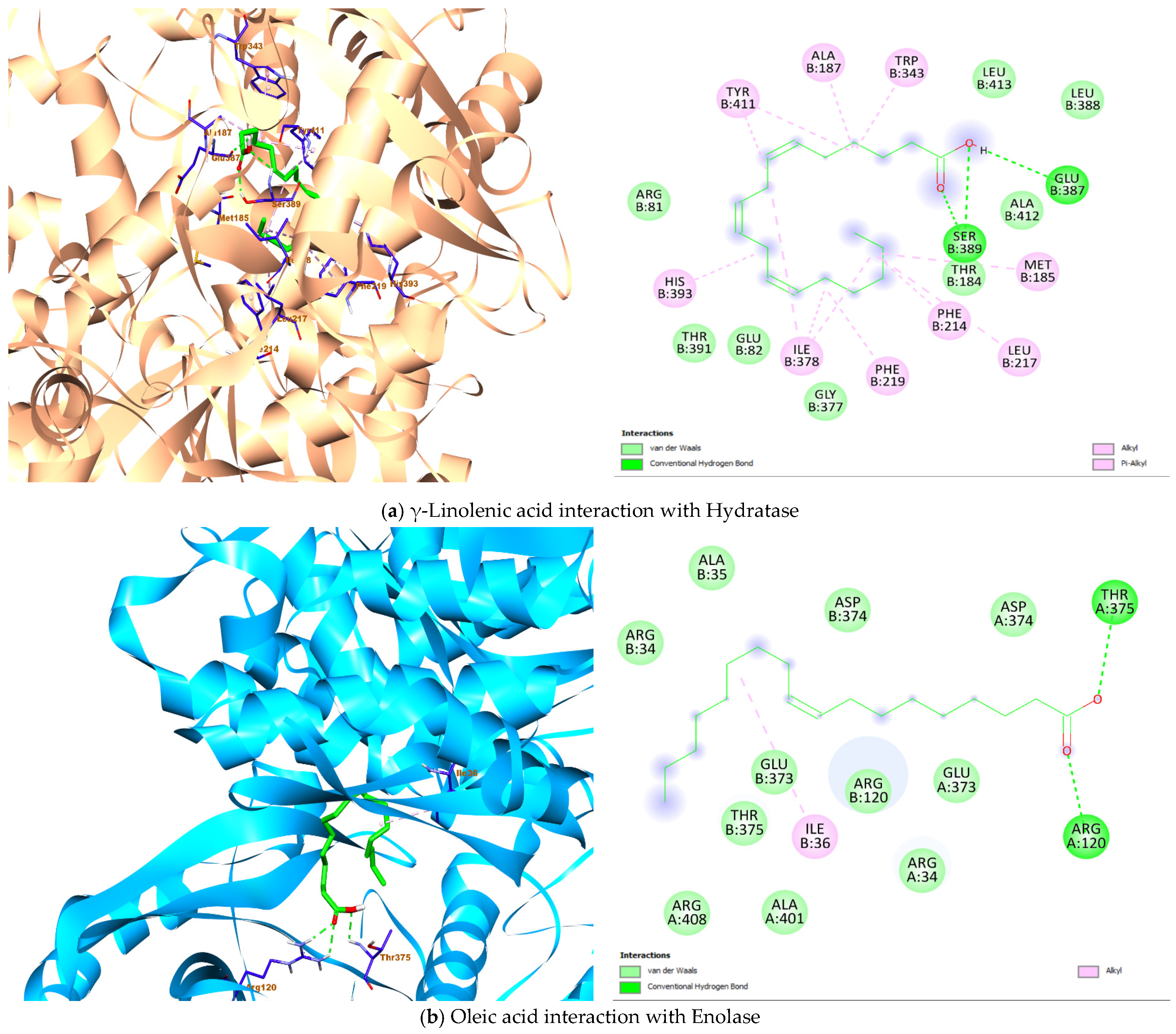 - Khoshnevis, S.; Neumann, P.; Ficner, R. Hydratase from Lactobacillus Acidophilus in a Ligand Bound Form (LA LAH): 4ia6. RCSB PDB 2013. [Google Scholar] [CrossRef]