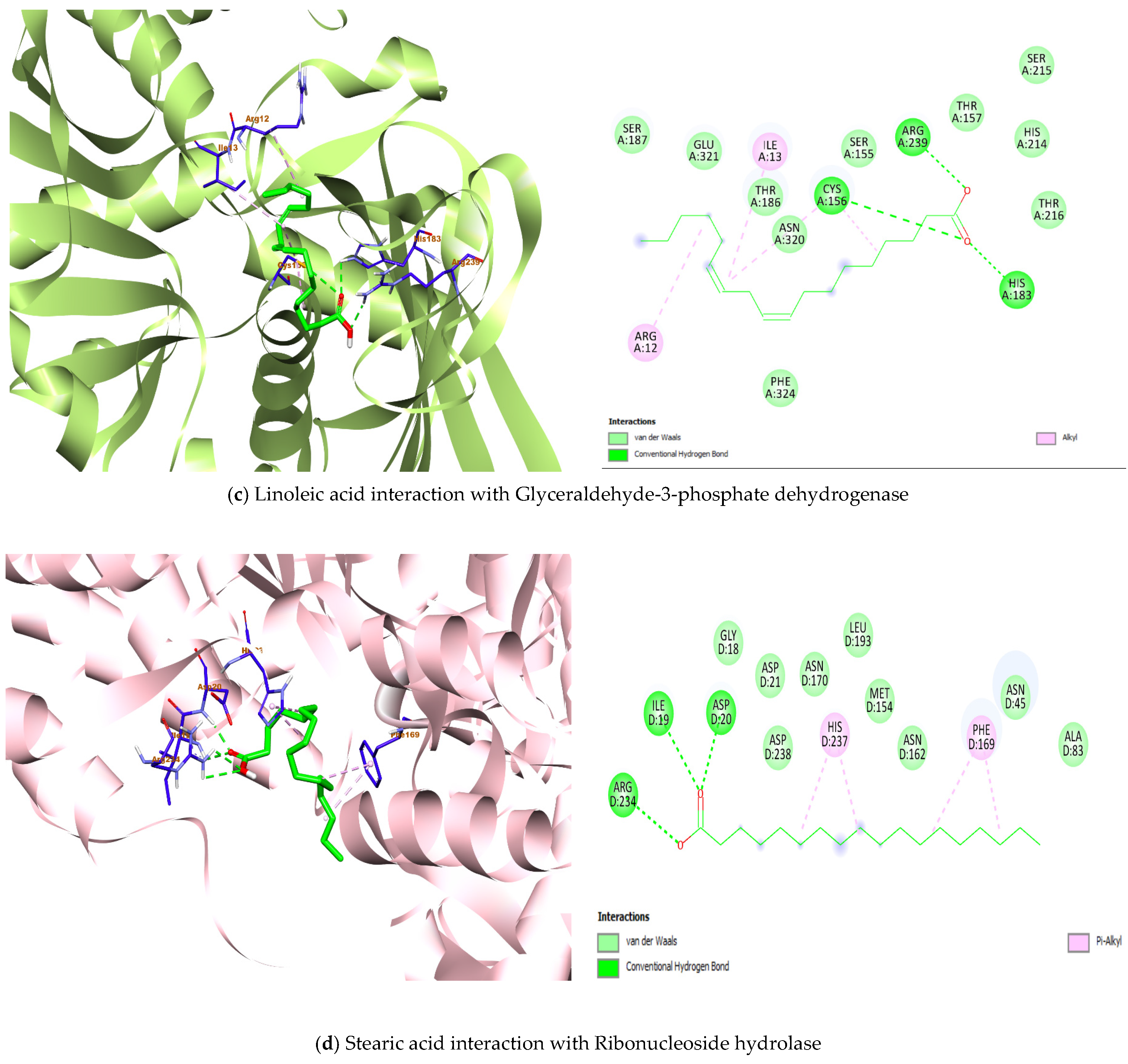 | 5 | Oleic acid C18:1 | −5.2 | −4.8 | −4.1 | −5.1 | VAL B:77, ARG B:78,THR B:350, PHE B:398,GLN B:405, VAL B:461, VAL B:463, | ILE B:36,ARG A:120, THR A:375 | ARG B:12, ILE B:13,SER B:125,CYS B:156 | ASP D:20,PHE D:169,HIS D:237 |