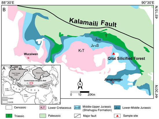 The QSF is located in Xinjiang, China, approximately 100 km northeast of Qitai County. It occurs within the eastern Shishugou Formation outcrops, exposed along the south Kalamaili Range in the eastern Junggar Basin of the southwestern Altaids (Figure 1) [33,34]. The formation strata dip between 0–10 degrees in a generally westward direction, resulting from the influence that the bordering Kalamaili Range exerted on the adjacent Jurassic strata [34]. The formation consists primarily of a basal conglomerate, interbedded mudstone and sandstone sequences, red beds, and multiple tuff layers, collectively indicative of deposition in an alluvial–fluvial floodplain environment. It was chronologically attributed to the Middle–Late Jurassic [29,33,34,35]. The silicified forest horizon lies in the sandstone-mudstone interval of the upper part of the Shishugou Formation, where ancient trees grew on the weathered crust and were covered by a layer of gray-white tuff [18].
