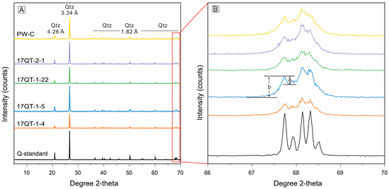 X-ray diffraction (XRD) diffraction spectra (A) and five finger peak spectra (B) of well-preserved Qitai silicified wood samples. “a” and “b” represent peak height of the 67.8° 2θ (1.38Å d-spacing) diffraction peak above background level. Abbreviation: Qtz = quartz.