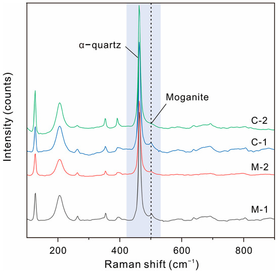 Macrocrystalline quartz was rarely observed in the Qitai silicified wood samples, occurring only as a late-stage crystalline phase within voids. In some cases, it grows in free space and displays a radial-oriented pattern surrounding the silicified wood matrix center, with the c-axis oriented nearly perpendicular to the center, forming external euhedral terminations [18]. Occasionally, trigonal α-quartz exhibiting a rhombohedron-dominated habit (pseudocubic quartz) is observed (Figure 5A). Microcrystalline quartz sometimes occurs as euhedral crystals with complete terminations, developing within micro-scale cellular pores. Their crystallographic orientation varies, ranging from random with no consistent alignment between adjacent crystals to perpendicular to the cell wall (Figure 5B,D,E). Commonly, it occurs as randomly oriented anhedral, mosaic-like grains, showing distinct birefringence under polarized light (Figure 5C). Typical lepispheres indicative of opal-CT were not observed by SEM. Exceptionally in a sample, the cell lumina were observed to be filled with fine-grained minerals, exhibiting overall optical darkness under cross-polarized light (Figure 5E). Areas of complete extinction, designated as “mottle areas”, were attributed to the superposition of opaque impurities by plane-polarized light confirmation (Figure 5F). In contrast, regions without such impurities were labeled “clean areas”. Raman analysis conducted on both clean and mottle areas not only revealed the predominance of α-quartz (465 cm−1) but also showed the weak moganite band at 501 cm−1 of varying intensities (Figure 6).