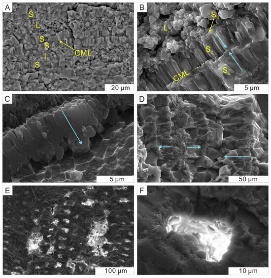 SEM images showing differential distribution of silica minerals in cellular structure of high-fidelity preservation. The blue arrow represents the growth direction of the quartz columns inside cell walls. (A) Elongate, columnar, subhedral microcrystalline quartz grains growing perpendicularly within the cell wall, while lumina are being filled with microcrystalline grains. Longitudinal section. (B) Anhedral microcrystalline quartz lining the innermost layer of cell wall, while columnar quartz is extending outward from this layer and the crystal fronts are terminating at the compound middle lamella. Longitudinal section. (C) The termination surface showing crystal impressions. Longitudinal section. (D) Divergent two to three layers of quartz crystals within cell walls. Longitudinal section. (E,F) The center of lumina being unsilicified, and the wall being lined with euhedral quartz. Transverse section. Abbreviation: S = secondary wall, L = lumen, CML = compound middle lamella, S2 = the middle layer of secondary wall, S3 = the inner layer of secondary wall.