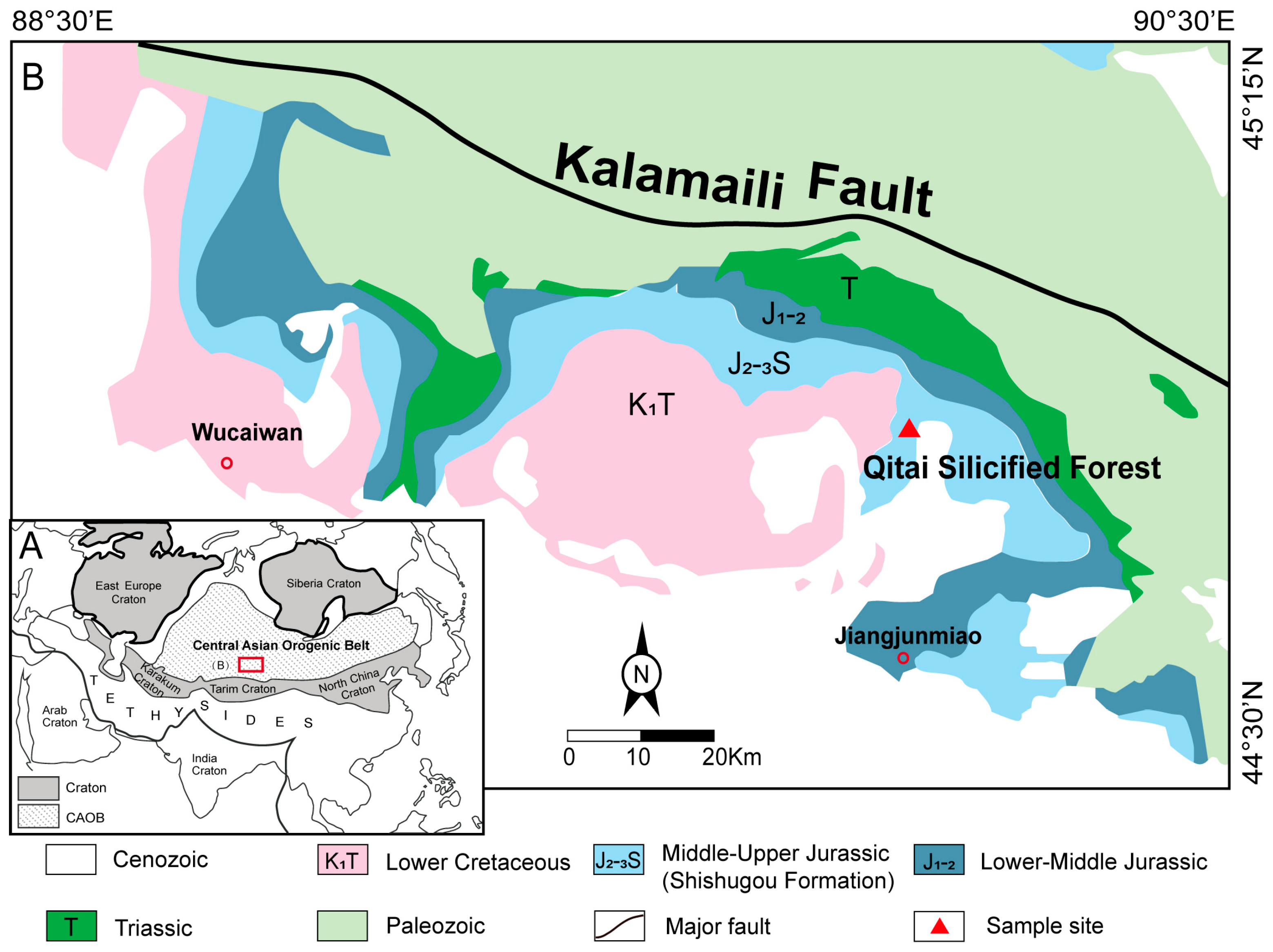 - McKnight, D.M. Fluvial sedimentology of an Upper Jurassic petrified forest assemblage, Shishu Formation, Junggar Basin, Xinjiang, China. Palaeogeogr. Palaeoclimatol. Palaeoecol. 1990, 79, 1–9. [Google Scholar] [CrossRef]