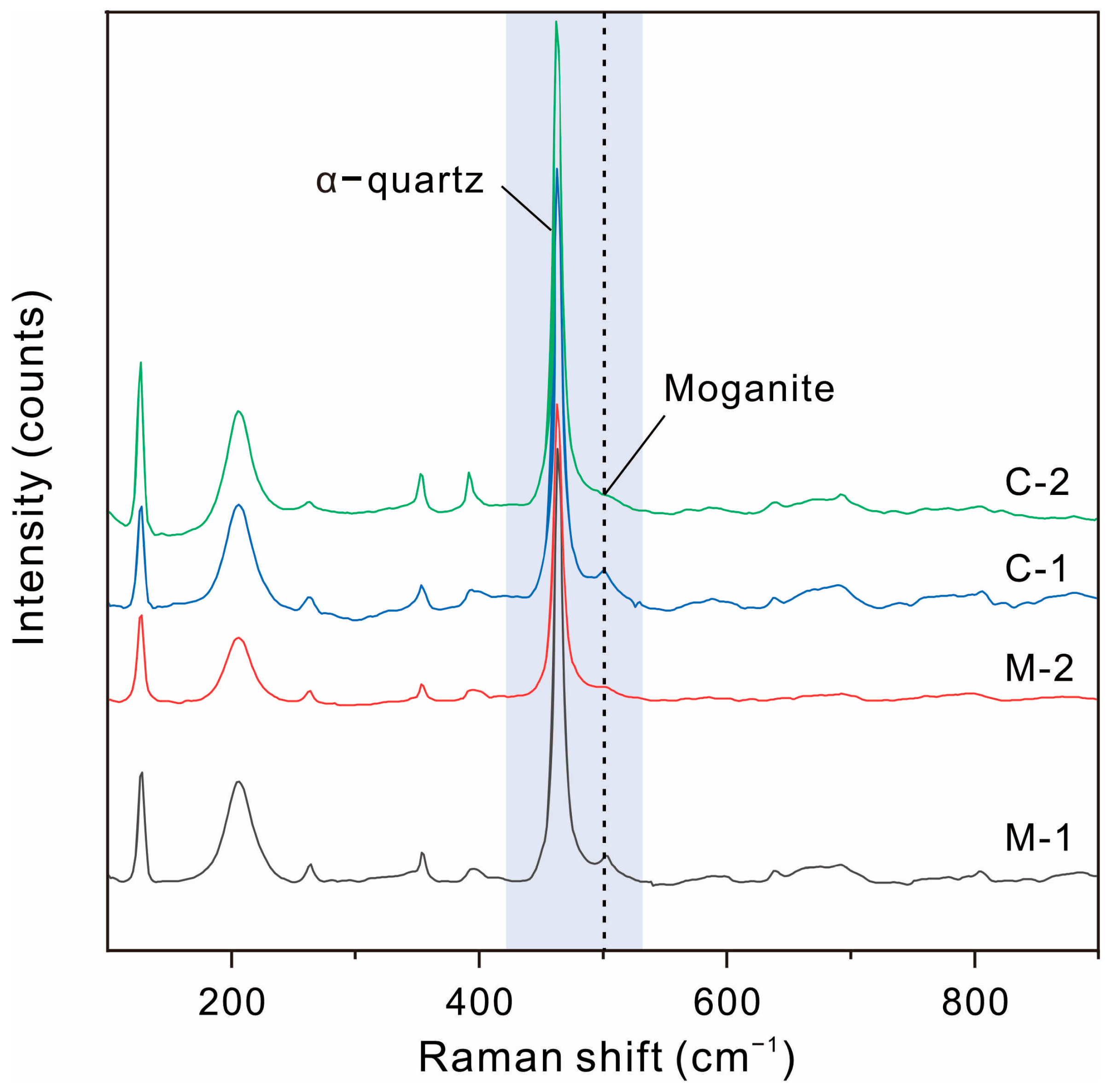 - Heaney, P.J.; McKeown, D.A.; Post, J.E. Anomalous behavior at the I2/a to Imab phase transition in SiO2-moganite: An analysis using hard-mode Raman spectroscopy. Am. Mineral. 2007, 92, 631–639. [Google Scholar] [CrossRef]