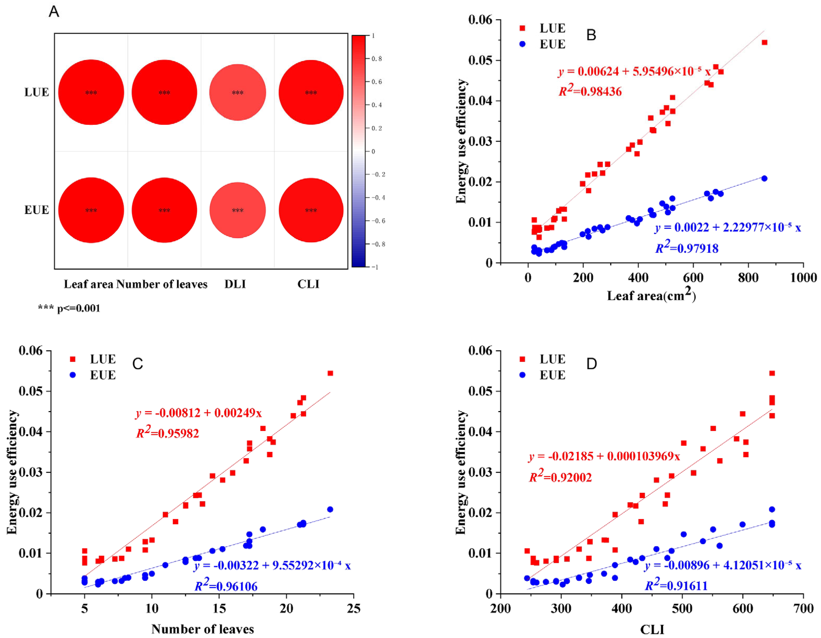 2.5. Correlation Analysis of Plant Morphology, Light Environment, and LUE/EUE
