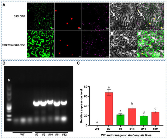Subcellular localization of PoMPK3 and molecular identification of transgenic Arabidopsis lines. (A) Subcellular localization analysis of 35S:PoMPK3–GFP and 35S:GFP (control) in N. benthamiana epidermal cells. Confocal microscopy images were captured at 48 h post-agroinfiltration (scale bar = 20 μm). Images were acquired using a fluorescence microscope with 488 nm (GFP) and 405 nm (DAPI) laser lines. (B) Genomic PCR verification of transgenic A. thaliana lines (line #2, #9, #10, #11, and #12), and M indicated DNA ladder marker. (C) qRT-PCR analysis of PoMPK3 relative expression levels in leaves of WT and transgenic A. thaliana lines (line #2, #9, #10, #11, and #12). Data represents SD (n = 3 biological replicates), with each experiment consisting of technical triplicates. The significance was indicated using the a, b, c, d, e letter, with a p value ≤ 0.05 considered significant.