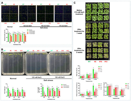 To functionally characterize the role of PoMPK3 in salt tolerance, stable transgenic A. thaliana lines overexpressing PoMPK3 were generated through A. tumefaciens-mediated transformation. Homozygous T3 generation lines were obtained through self-pollination and antibiotic selection. As shown in Figure 2B, genomic PCR analysis using primers specific to PoMPK3 confirmed the successful integration of the transgene into the genome of multiple independent lines (line #2, #9, #10, #11, #12), as evidenced by the presence of the expected amplicon, which was absent in WT. In addition, the expression level of PoMPK3 was quantitatively assessed by qRT-PCR. As shown in Figure 2C, substantial accumulation of PoMPK3 was detected in the leaves of all transgenic lines. Notably, transgenic lines #2, #10, and #12 exhibited the most pronounced overexpression levels, establishing them as ideal candidates for subsequent phenotypic screening.