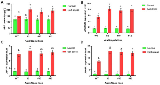 Following a 24 h exposure to sterile water (control) or 175 mM NaCl (salt stress) in pot culture, leaves and roots were collected from two-week-old WT and PoMPK3 transgenic Arabidopsis seedlings for analysis. To explore whether PoMPK3 regulated salt tolerance of Arabidopsis plants by modulating ABA metabolism, we examined endogenous ABA content and ABA-related gene expression levels. As shown in Figure 4A, salt stress treatment triggered ABA accumulation in both WT and PoMPK3 overexpressing Arabidopsis seedlings, with transgenic lines exhibiting a more pronounced response, and the endogenous ABA content was significantly higher in the transgenic lines compared to WT under salt stress. Notably, line #2 showed the most significant increase, with ABA levels reaching 1.36 times that of WT. Meanwhile, at the transcriptional level, salt stress significantly increased the expression of key ABA pathway genes, including the ABA biosynthesis gene AtNCED3 (Figure 4B), the ABA receptor gene AtPYR1 (Figure 4C), and the downstream ABRE-binding factor AtABF3 (Figure 4D). Under normal conditions, transcript levels of these genes in lines #2, #10, and #12 were similar to those in WT. However, salt stress significantly induced their expression in all transgenic lines, with AtPYR1 showing the most prominent upregulation in line #2, significantly exceeding that in lines #10 and #12. These results indicated that PoMPK3 expression effectively activated the ABA signaling pathway in Arabidopsis under salt stress, as demonstrated by increased endogenous ABA levels and upregulation of key pathway genes.