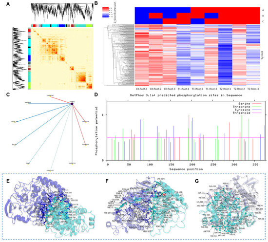 Identification of the co-expression network and molecular docking analysis of PoMPK3 with downstream TFs in P. oleracea under Salt Stress. (A) Construction of weighted gene co-expression network and module identification. The network was constructed using a soft-thresholding power to satisfy scale-free topology. Genes were clustered into 11 distinct co-expression modules, each represented by a unique color (the grey module contained 151 genes that could not be clustered and lacked biological relevance). (B) Expression profiling of PoMPK3 and its co-expressed DEGs under salt stress. A heatmap displayed the expression patterns (FPKM value) of the 167 DEGs from the green–yellow module (including PoMPK3) across different experimental conditions (CK, T1, T2 in roots/leaves). A stringent screening criterion was applied to identify DEGs with strong salt stress responsiveness as tightly co-expressed candidates. The heatmap columns were grouped into three clusters (labeled A, B, and C on the right), which correspond to the control (CK), early salt stress (T1), and late salt stress (T2) conditions, respectively. Data represents SD (n = 3 biological replicates). (C) Screening of transcription factors co-expressed with PoMPK3 and their interaction network. Nine TFs were identified from the candidate DEGs. A weighted correlation network highlighted TFs as having the most significant co-expression relationships (highest weight coefficient) with PoMPK3. Node size reflected connectivity degree, while edge thickness indicated co-expression weight. (D) In silico prediction of potential phosphorylation sites on the PoMPK3 protein. The NetPhos server predicted numerous high-confidence phosphorylation sites (score > 0.7) on serine (S), threonine (T), and tyrosine (Y) residues. The predicted kinases responsible for these modifications include PKC, CKII, PKA, GSK3, CaMKII, and CDC2. Molecular docking model of the (E) P oMPK3–PoWRKY33, (F) PoMPK3–PoWRKY40, and (G) PoMPK3–PoWRKY53 complexes and prediction of phosphorylation sites. In these models, the PoMPK3 protein was represented as a solid surface colored in a consistent shade of cyan. The interacting partners are shown as cartoon representations in purple (E), dark blue (F), and light grey (G), respectively. Key residues at the predicted interaction interfaces were shown as sticks and labeled.