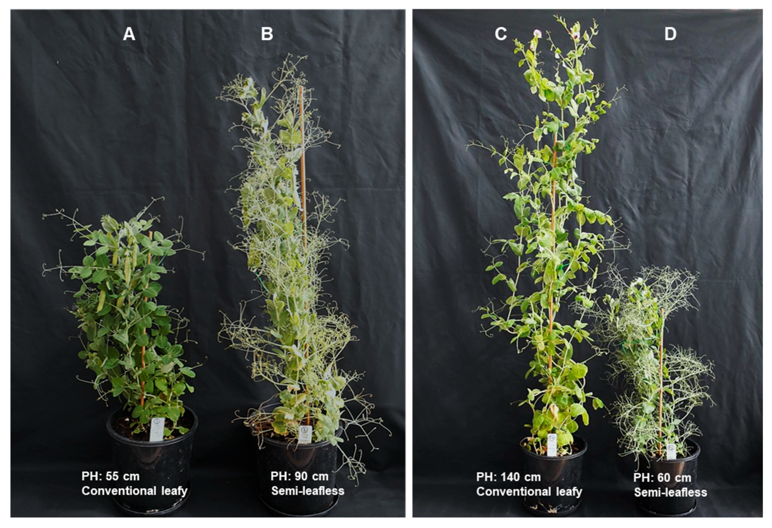 - Tran, C.T.; Becker, H.C.; Horneburg, B. Agronomic performance of normal-leafed and semi-leafless pea (Pisum sativum L.) genotypes. Crop Sci. 2022, 62, 1430–1442. [Google Scholar] [CrossRef]