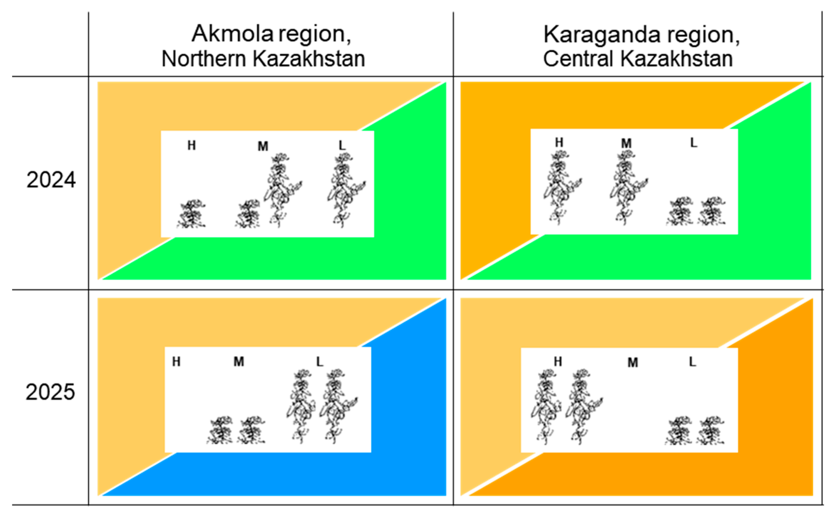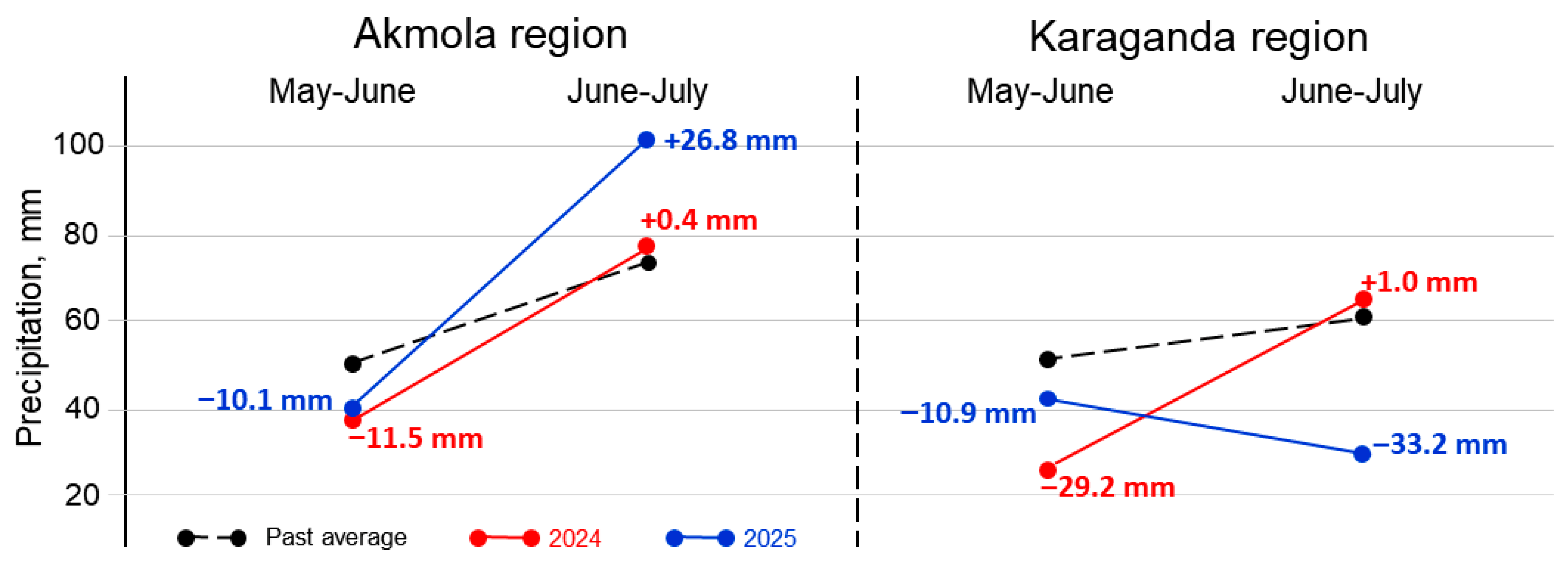 | (B) | Akmola reg., 2025, early drought and excessive rains after | Karaganda reg., 2025, moderate early drought and increased after | ||||||||