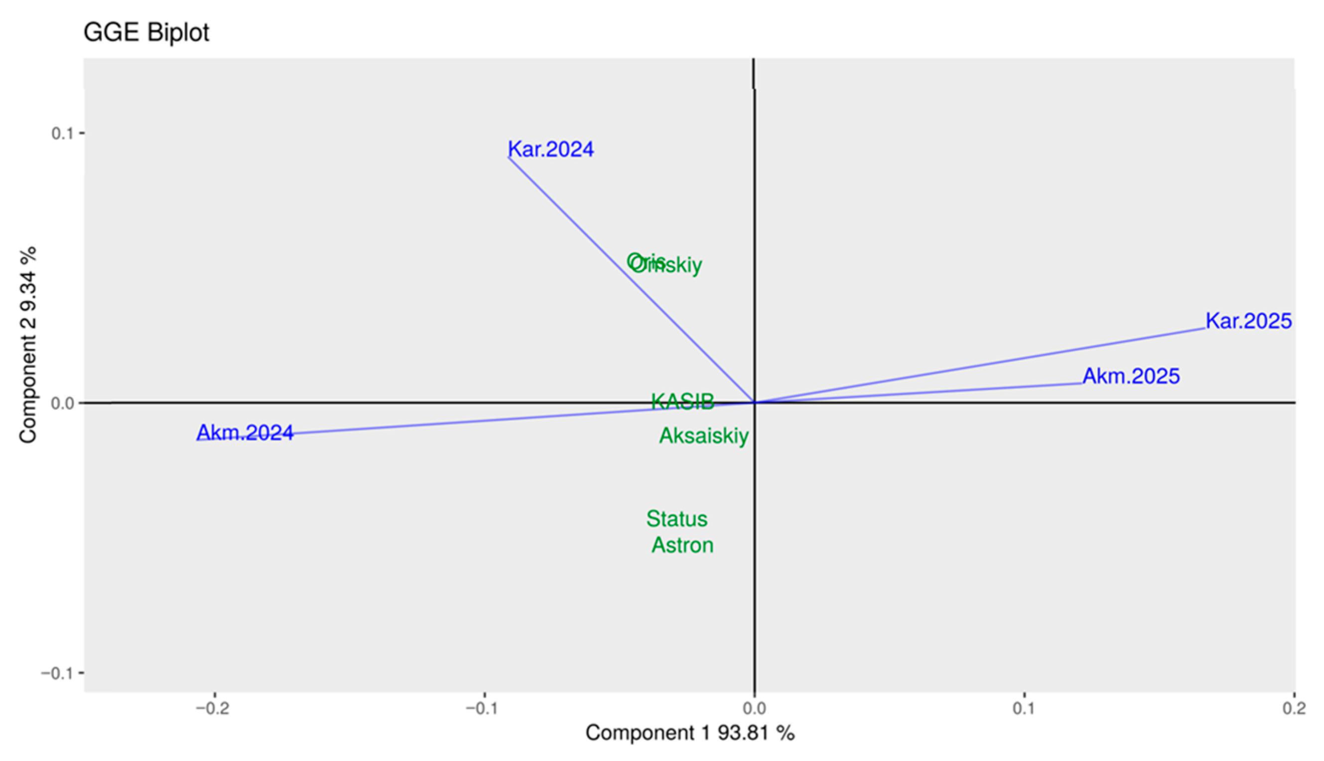 - ICARDA. BioComputing Online (Phase II): GGE Biplot Analysis. Available online: https://shiny-analytics.ebsproject.org/gge/?utm_source=chatgpt.com (accessed on 1 June 2025).