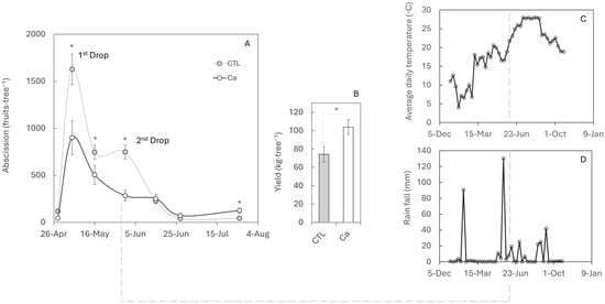 Effect of calcium applications on fruit set and premature fruit drop. (A) Number of dropped fruits recorded every 15 days using nets placed under control (CTL) and calcium-treated (Ca) trees. (B) Yield at harvest in October. Values represent the mean of three replicates of five trees each. Asterisks indicate significant differences (p ≤ 0.05). Standard errors (SEs) are indicated by vertical bars; in some cases, the SE is smaller than the symbol. (C) Average daily temperature and (D) rainfall were monitored throughout the productive period.