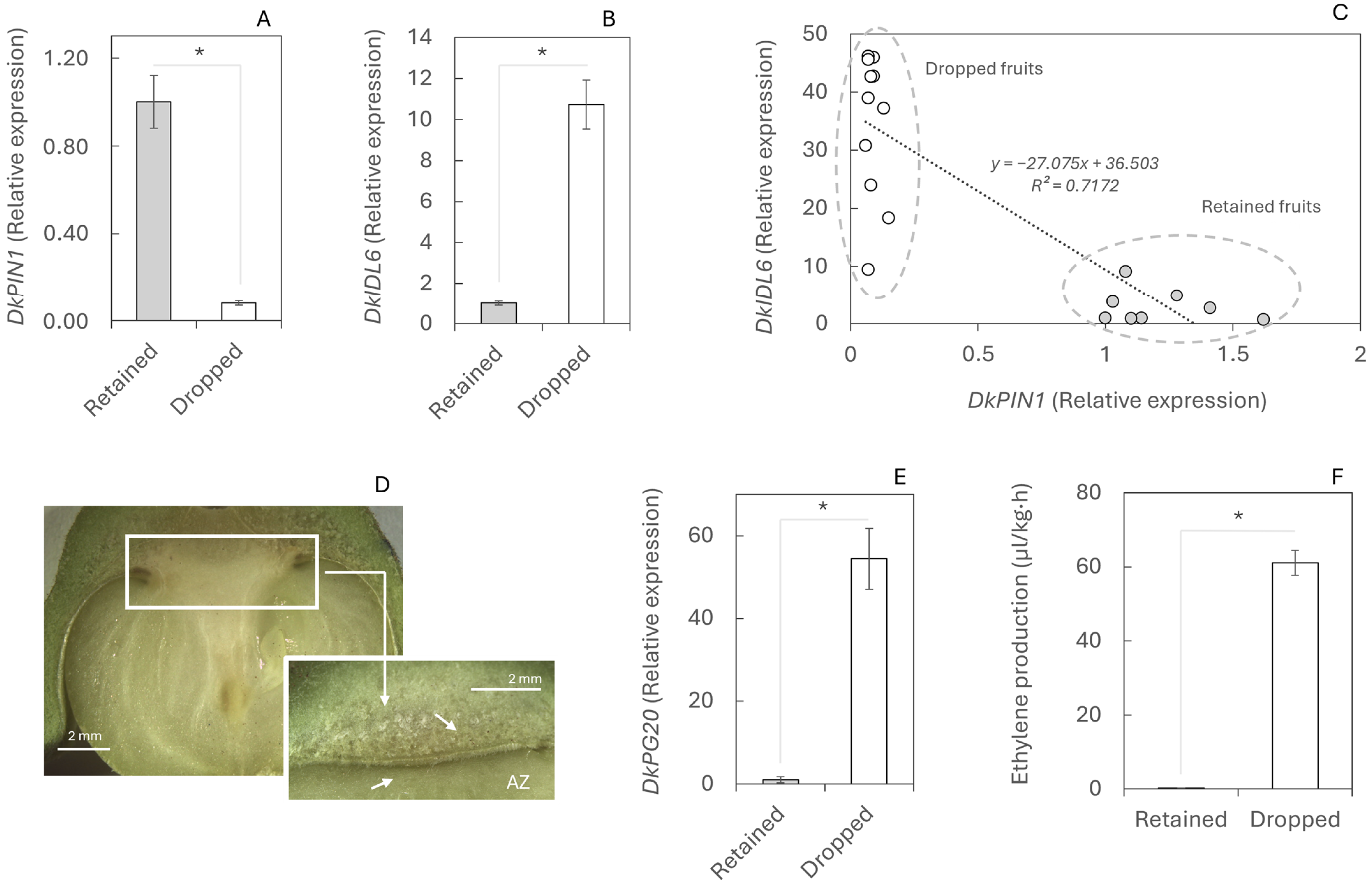 Abscission mechanism during physiological fruit drop in retained and dropped fruits. Gene expression of DkPIN1 (A), DkIDL6 (B), and DkPG20 (E)—involved in polar auxin transport, initiation of the abscission process (stage C), and cell wall pectin degradation, respectively—was determined by RT-qPCR. (C) Correlation between DkPIN1 and DkIDL6. (D) Calyx abscission zone. (F) Ethylene production in fruits abscised during the night. Twelve fruits were analysed; for RT-qPCR, each value corresponds to a single fruit, whereas three biological replicates of three fruits each were used for ethylene measurements. Asterisks indicate statistically significant differences (p ≤ 0.05). Standard errors (SEs) are shown as vertical bars.