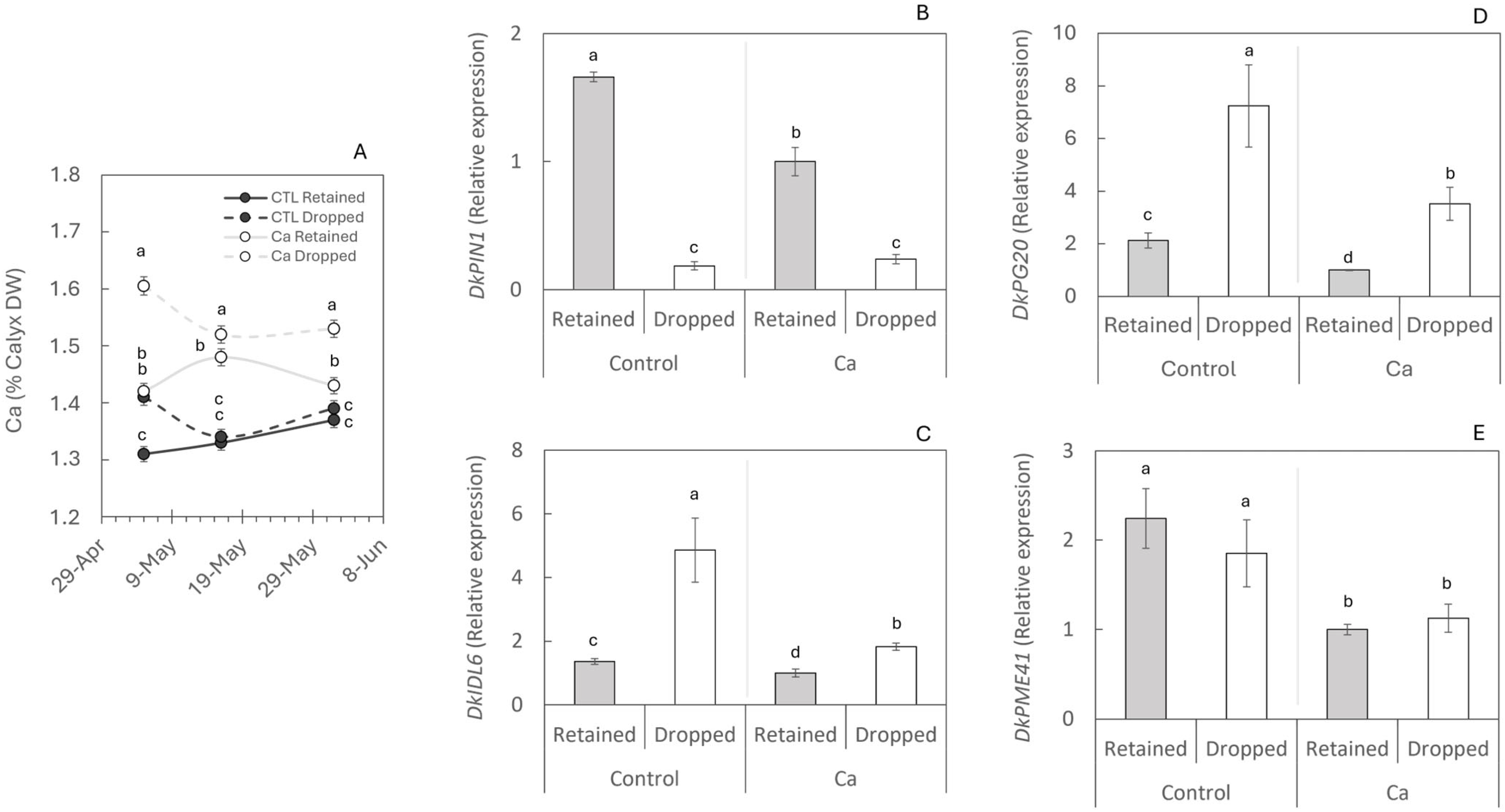 Effect of calcium treatments on the molecular mechanism of abscission. (A) Calcium concentration in the calyx of 20 retained and 20 dropped fruits per treatment. Gene expression of DkPIN1 (B), DkIDL6 (C), DkPG20 (D), and DkPME41 (E)—involved in polar auxin transport (B), initiation of the abscission process at stage C (C), and cell wall pectin degradation (D,E)—was determined by RT-qPCR. Five fruits per treatment were analysed, and each value represents a single fruit. Letters indicate statistically significant differences (p < 0.05). Standard errors (SEs) are shown as vertical bars.