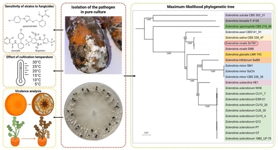 During the inspection of vegetable storage facilities, softened carrot tissues with dark-colored sclerotia on white mycelium were collected, placed in paper bags, transported to the laboratory, and stored at 4 °C until analysis. Pure cultures were obtained following the methods of [