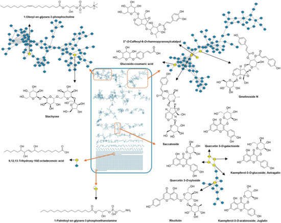 A metabolomics investigation guided by LC–MS/MS analysis was conducted to elucidate the chemical complexity of the methanolic extract of G. philippensis leaves. For metabolite annotation and structural classification, MS/MS-based molecular networking was employed using the Global Natural Products Social Molecular Networking (GNPS) platform. Spectral library matching facilitated dereplication of known metabolites, while clustering based on fragment ion similarity revealed relationships among structurally related compound families. The constructed molecular network—based on data acquired in negative ionization mode—consisted of 2079 nodes, grouped into 157 clusters, including 737 self-looped nodes (Figure 2). In this network, nodes represent precursor ions, and edges indicate the mass differences between connected features. GNPS-based molecular networking enabled the dereplication of several secondary metabolite classes, including iridoid glycosides (e.g., gmelinoside N, saccatoside, and caffeoyl-rhamnopyranosyl catalpol), cinnamic acid derivatives (e.g., p-coumaric acid glucoside), flavonoids (e.g., astragalin, rhoifolin, juglalin, isoschaftoside, luteolin, and quercetin glucoside), as well as benzene sulfonic acids, phospholipids, and unsaturated fatty acids.