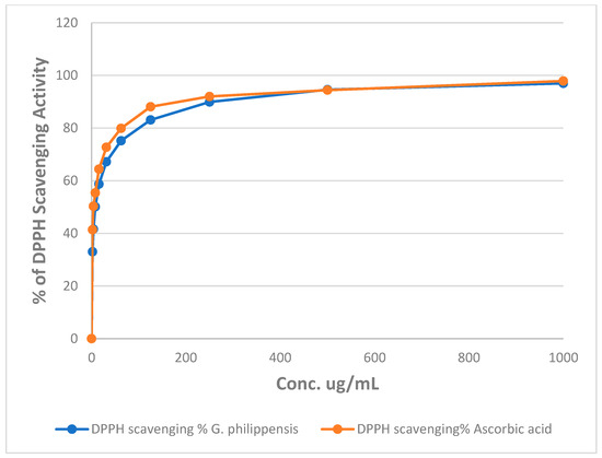 Changes in the % of DPPH assay of different concentrations of the methanol extract of G. philippensis and ascorbic acid (positive control).