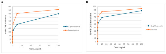 Acetylcholinesterase (A) and Butyrylcholinesterase (B) inhibitory activity of the methanol extract of G. philippensis leaves.