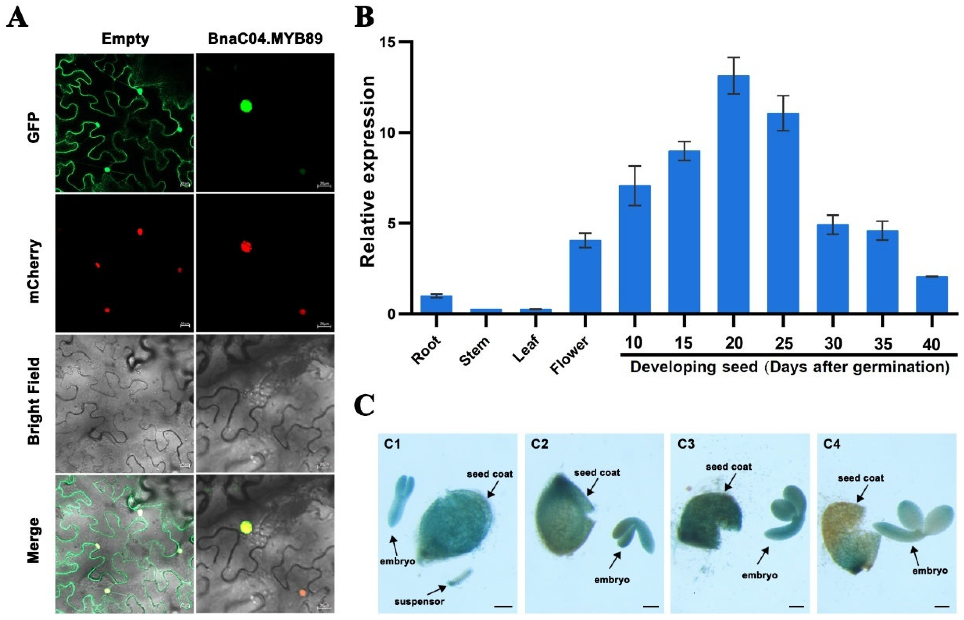 3.2. BnaC04.MYB89 Is Predominantly Expressed at the Seed Development Stage in Arabidopsis