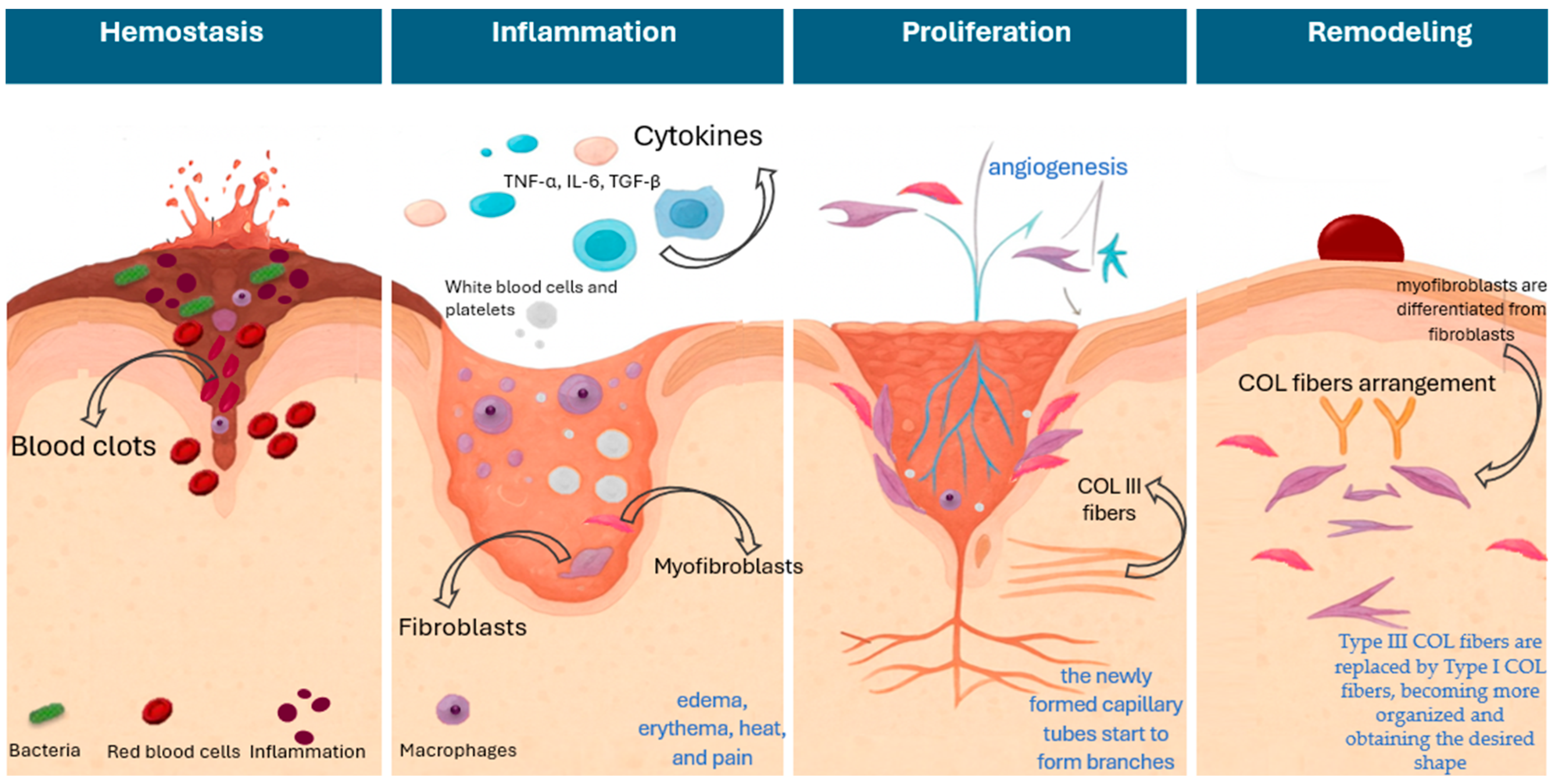 - Peña, O.A.; Martin, P. Cellular and Molecular Mechanisms of Skin Wound Healing. Nat. Rev. Mol. Cell Biol. 2024, 25, 599–616. [Google Scholar] [CrossRef]