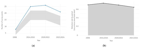 Despite these changes, period-specific detection rates (occurrence sites divided by the total number of surveyed sites) remained stable between 0.65 and 0.75 across all periods (Figure 1b). Sensitivity tests with alternative consolidation distances (ε = 20 m and 40 m) likewise showed consistent declines in the most recent period (−44.4% and −40.0% declines, respectively).