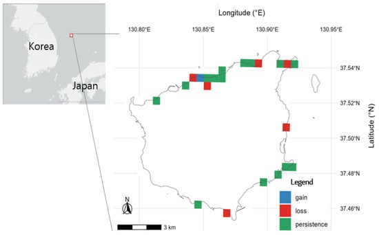 A 500 m grid was overlaid on Ulleungdo. Pooling all records, we dichotomized detections into past (2008–2022) and recent (2023–2024) and classified each cell as persistence (detected in both periods), loss (detected only in the past), gain (detected only in the recent period), or no detection (absent in both).