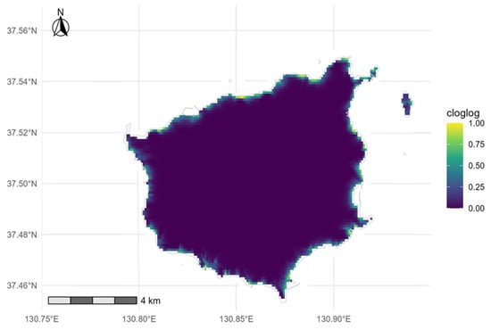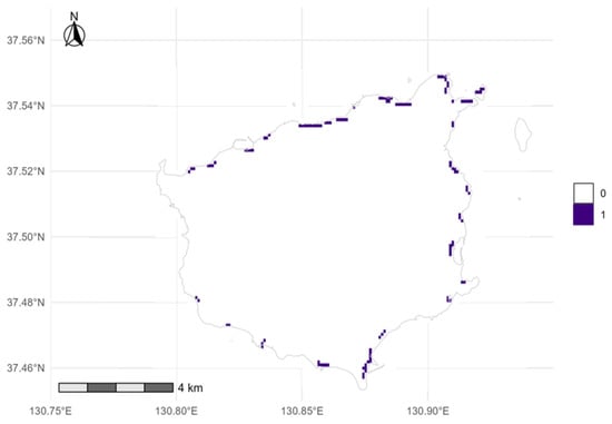 To match the 5-year national review cycle, we defined four periods: (1) 2008, (2) 2014–2016, (3) 2020–2022, and (4) 2023–2024. To avoid pseudo-replication, occurrences were grouped to site-representative points using DBSCAN (dbscan::dbscan, ε = 30 m, minPts = 1, [36]), which merges duplicates and nearby detections within typical clump sizes of S. takesimensis (20–30 m [16]) and plausible GPS error in steep coastal terrain (10–30 m). Sensitivity checks at ε = 20 and 40 m followed the same workflow. For each period, we computed the number of unique sites and detection rates (presence sites divided by the total number of surveyed sites) with 95% bootstrap CIs using boot::boot (R = 1000). The 500 m analysis grid was created with sf::st_make_grid (cellsize = 500) and populated by spatial join (sf::st_join).