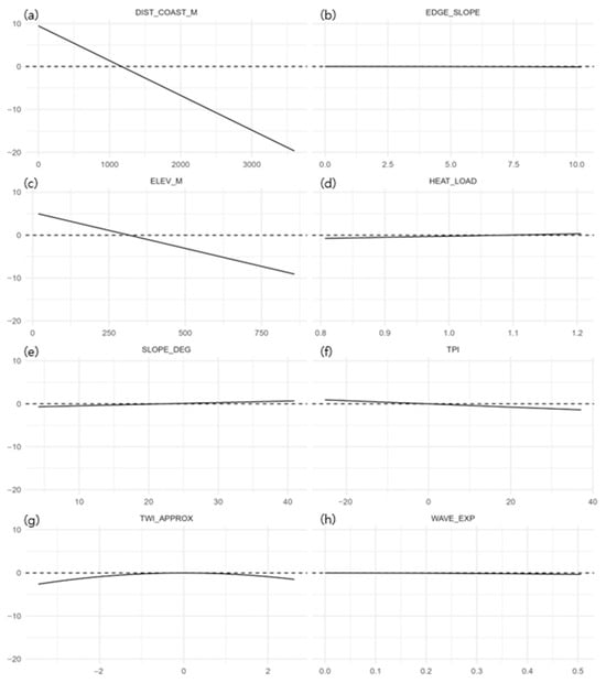 In partial response (Δ-link) curves, the distance to coast (DIST_COAST_M) and elevation (ELEV_M) showed negative effects, indicating increasing suitability at low elevations close to the shore (Figure 5). TPI displayed a weak negative tendency; SLOPE_DEG showed a gentle convex response (avoidance of overly steep slopes); and TWI_APPROX showed a mild unimodal peak (preference for intermediate wetness). The contributions of other predictors were comparatively small.