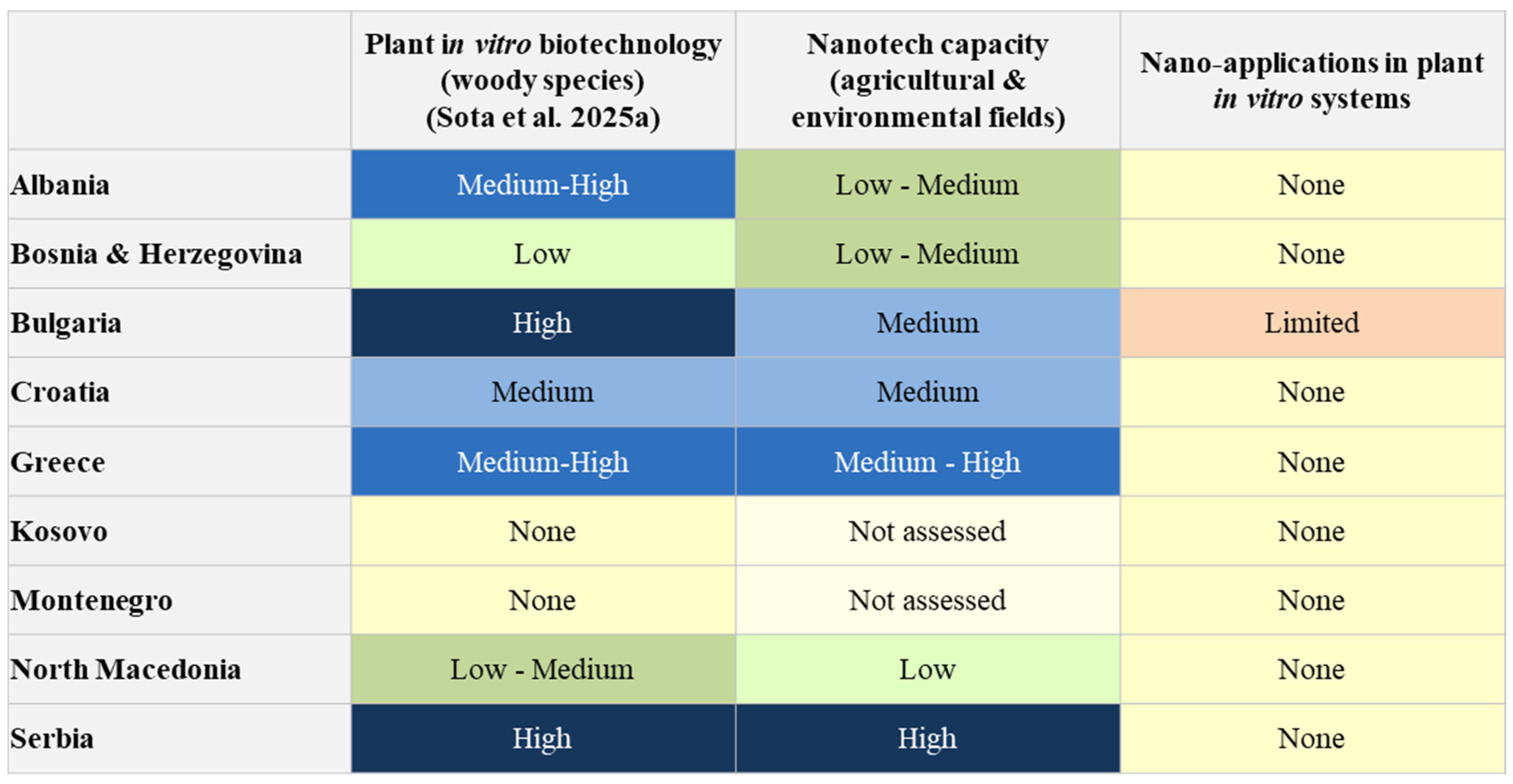 Sota, V.; Jevremović, S.; Abraham, E.; Daničić, V.; Bošnjak, D.; Nacheva, L.; Cvjetković, B.; Andonovski, V.; Bogunović, S.; Kongjika, E.; et al. The Balkan Region and the “Nano Gap”: An Underexplored Dimension of In Vitro Biotechnology for Woody Plants. Plants 2025, 14, 3499. https://doi.org/10.3390/plants14223499