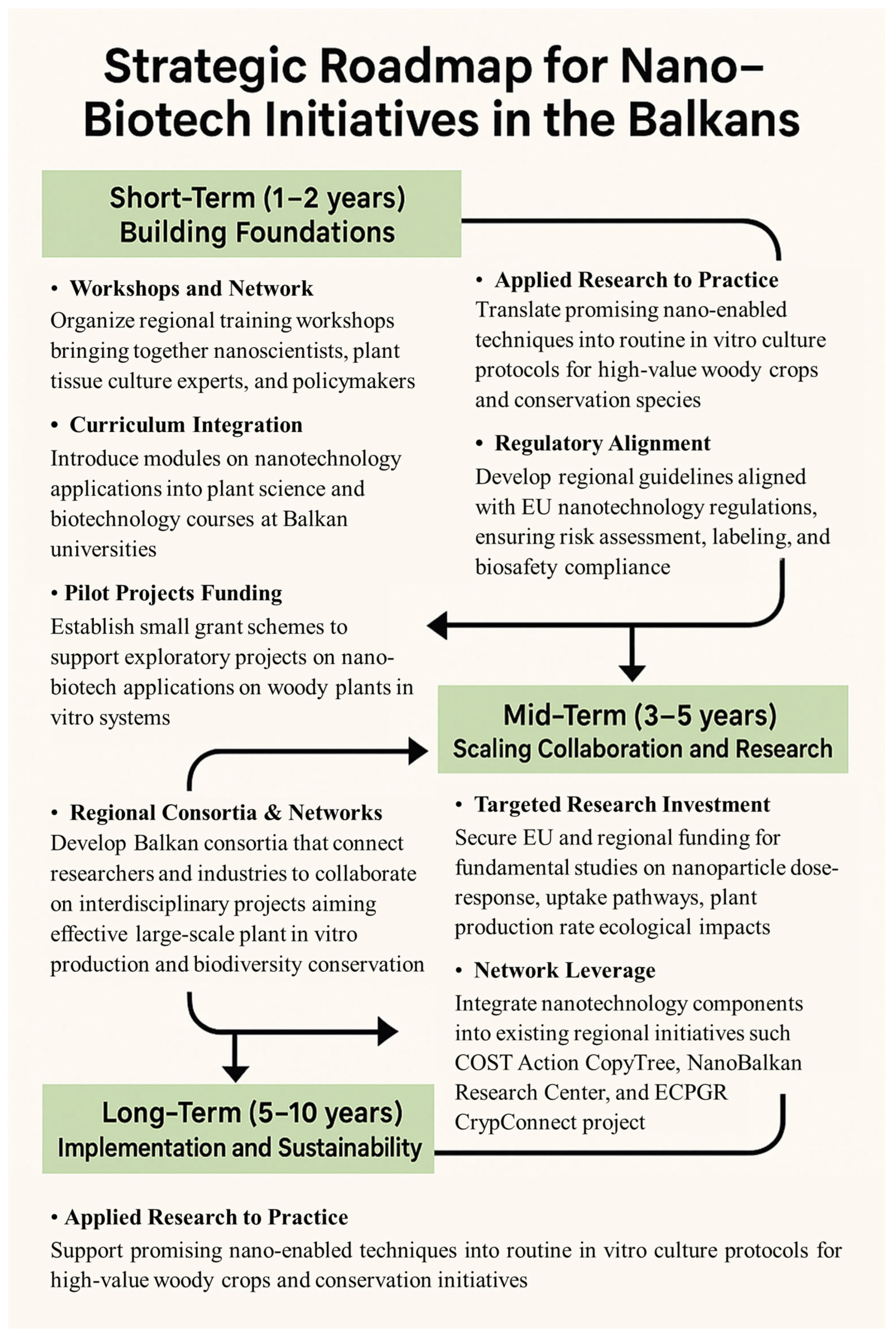 - International networks, such as CopyTree (https://www.cost.eu/actions/CA21157/; accessed on 4 September 2025), CryoConnect (https://www.ecpgr.org/working-groups/cryopreservation/cryoconnect; accessed on 4 September 2025) and the NanoBalkan Research Center, could help in integrating nano-research into existing international initiatives for the propagation and conservation of woody plants. Regional consortia can be useful for sharing best practices and collaborating on joint projects involving nano-applications in plant tissue culture, large-scale plant production, and the development of elite cultivars.