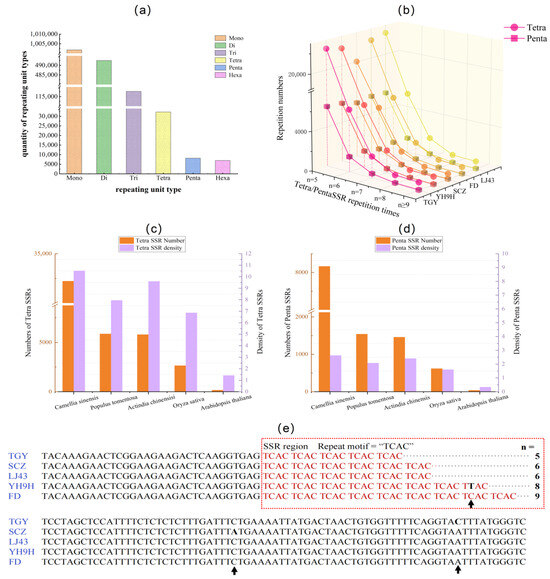 The distribution and variation in SSRs in the tea and other plant genomes. (a) The distribution of different types of SSRs in the genome of ‘Tieguanyin’. (b) The number of tetra- and penta-SSRs in the genomes of different tea cultivars (TGY ‘Tieguanyin’, YH9H ‘Yinghong 9 hao’, SCZ ‘Shuchazao’, FD ‘Fudingdabaicha’, LJ43 ‘Longjing43’). (c,d) Total number and density of identified tetra- and penta-SSRs in Camellia sinensis, Oryza sativa, Arabidopsis thaliana, and their flanking sequences in different tea cultivar genomes. The repeat motif and repeat number (n) were shown, and the arrows indicated the presence of an SNP mutation. (e) The sequence alignment of TGY, SCZ, LJ43, YH9H, and FD, marked with CsTetra11. The repeated units are highlighted in red boxes, where “n” represents the number of repeats and arrows indicate mutation sites within the sequence alignment.
